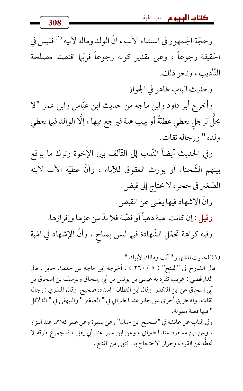 وأخرج أبو داود وابن ماجه من حديث ابن عبّاس وابن عمر " لا يحلُّ لرجلٍ يعطي عطيّةً أو يهب هبة فيرجع فيها , إلَّا الوالد فيما يعطي ولده " ورجاله ثقات.