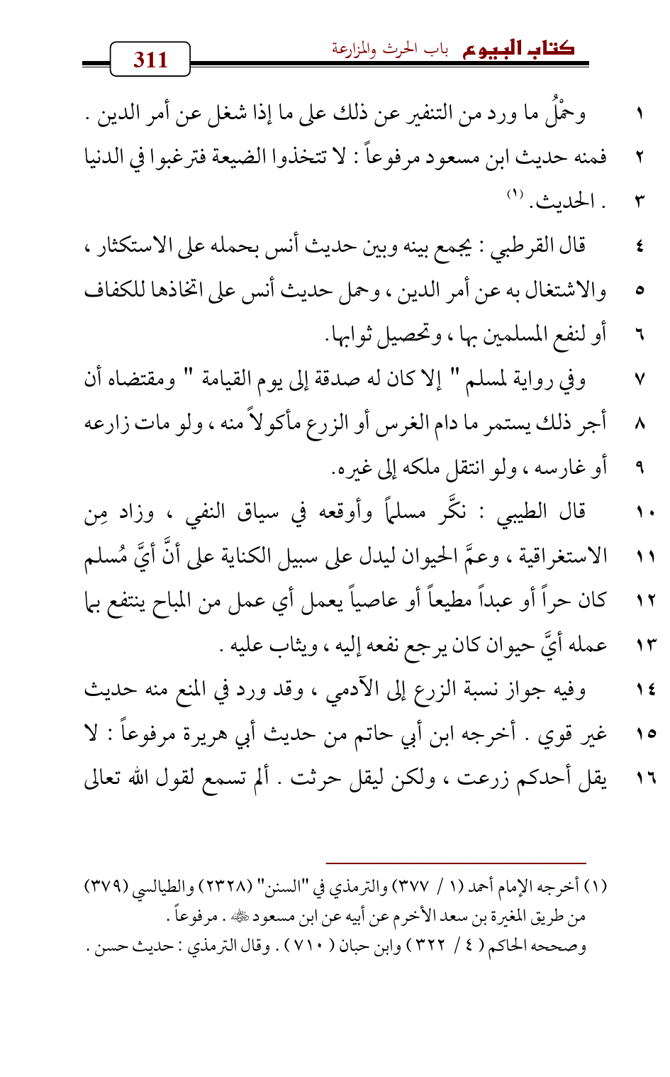 وحمْلُ ما ورد من التنفير عن ذلك على ما إذا شغل عن أمر الدين. فمنه حديث ابن مسعود مرفوعاً: لا تتخذوا الضيعة فترغبوا في الدنيا. الحديث. (¬1)