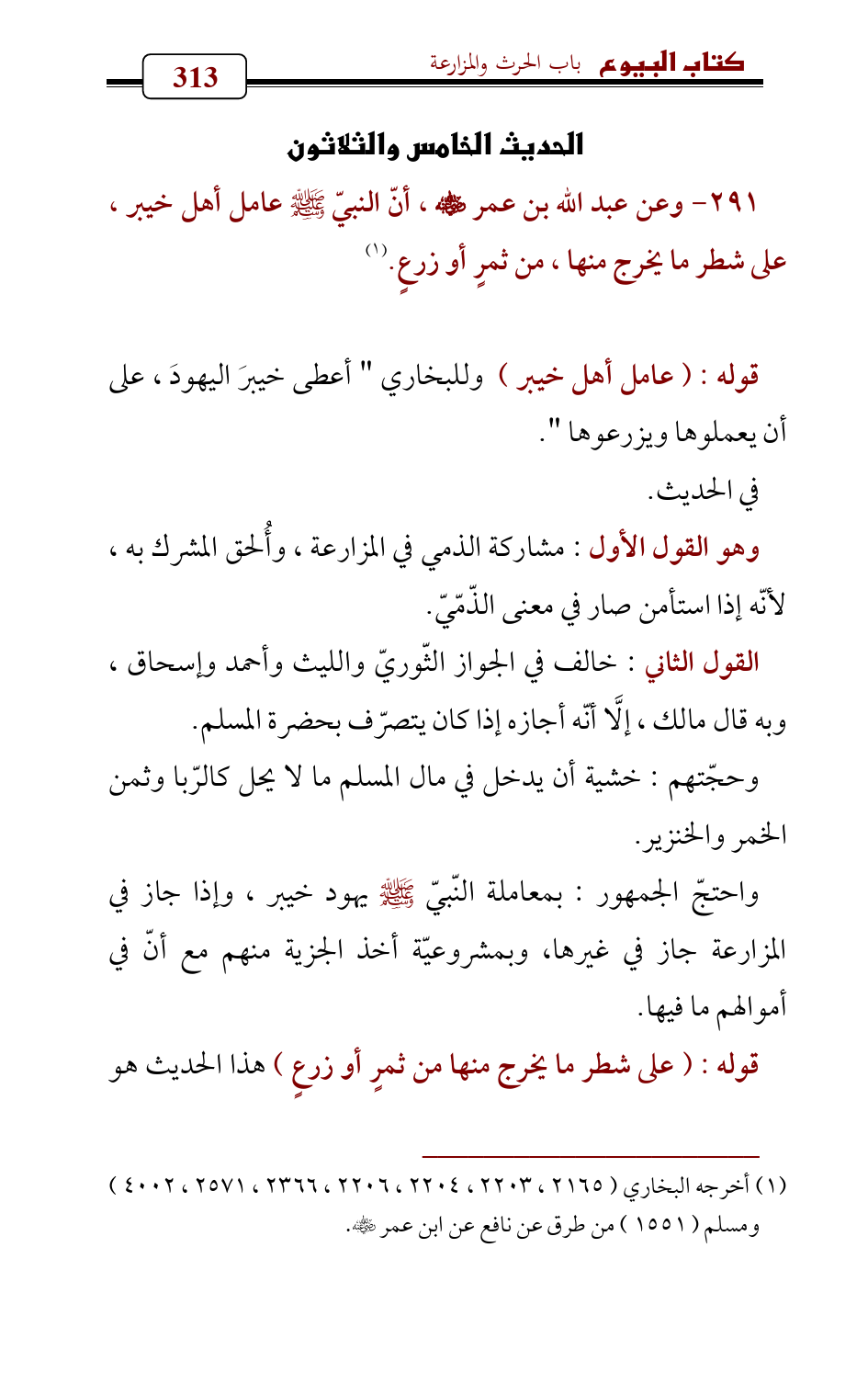 291 - وعن عبد الله بن عمر - رضي الله عنه - , أنّ النبيّ - صلى الله عليه وسلم - عامل أهل خيبر، على شطر ما يخرج منها، من ثمرٍ أو زرعٍ. (¬1)