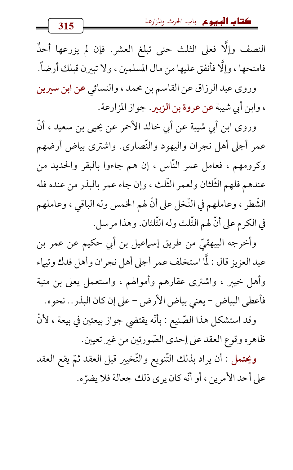 وأخرجه البيهقيّ من طريق إسماعيل بن أبي حكيم عن عمر بن عبد العزيز قال: لَمَّا استخلف عمر أجلى أهل نجران وأهل فدك وتيماء وأهل خيبر، واشترى عقارهم وأموالهم، واستعمل يعلى بن منية فأعطى البياض - يعني بياض الأرض - على إن كان البذر .. نحوه.