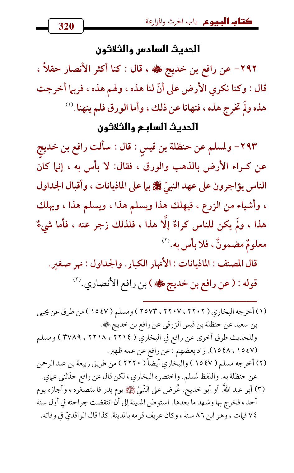 293 - ولمسلم عن حنظلة بن قيسٍ: قال: سألت رافع بن خديجٍ عن كراء الأرض بالذهب والورق، فقال: لا بأس به، إنما كان الناس يؤاجرون على عهد النبيّ - صلى الله عليه وسلم - بما على الماذيانات، وأقبال الجداول، وأشياء من الزرع، فيهلك هذا ويسلم هذا، ويسلم هذا، ويهلك هذا، ولَم يكن للناس كراءٌ إلَّا هذا، فلذلك زجر عنه، فأما شيءٌ معلومٌ مضمونٌ، فلا بأس به. (¬2)