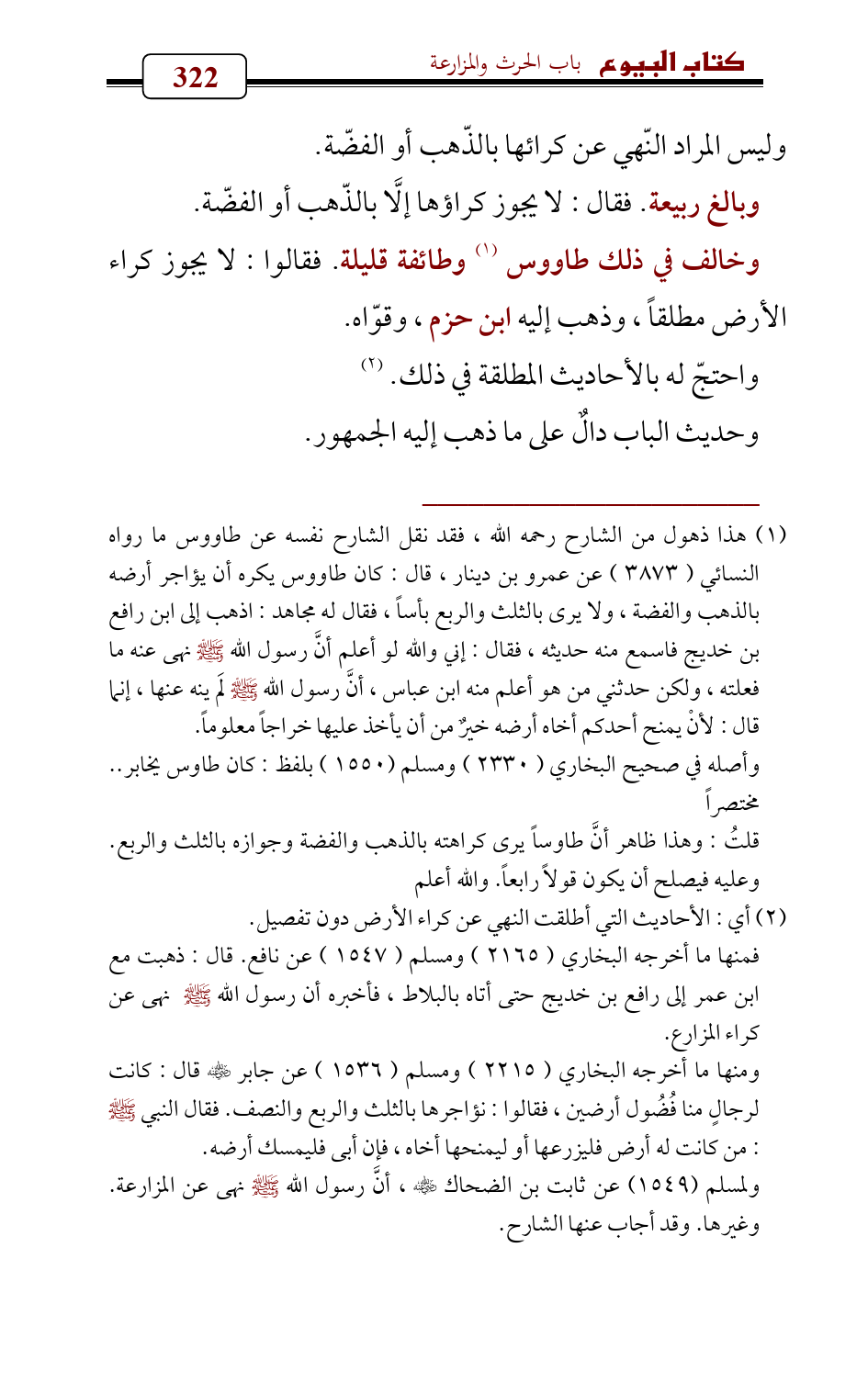 (¬1) هذا ذهول من الشارح رحمه الله , فقد نقل الشارح نفسه عن طاووس ما رواه النسائي (3873) عن عمرو بن دينار، قال: كان طاووس يكره أن يؤاجر أرضه بالذهب والفضة، ولا يرى بالثلث والربع بأساً، فقال له مجاهد: اذهب إلى ابن رافع بن خديج فاسمع منه حديثه، فقال: إني والله لو أعلم أنَّ رسول الله - صلى الله عليه وسلم - نهى عنه ما فعلته، ولكن حدثني من هو أعلم منه ابن عباس، أنَّ رسول الله - صلى الله عليه وسلم - لَم ينه عنها , إنما قال: لأنْ يمنح أحدكم أخاه أرضه خيرٌ من أن يأخذ عليها خراجاً معلوماً.