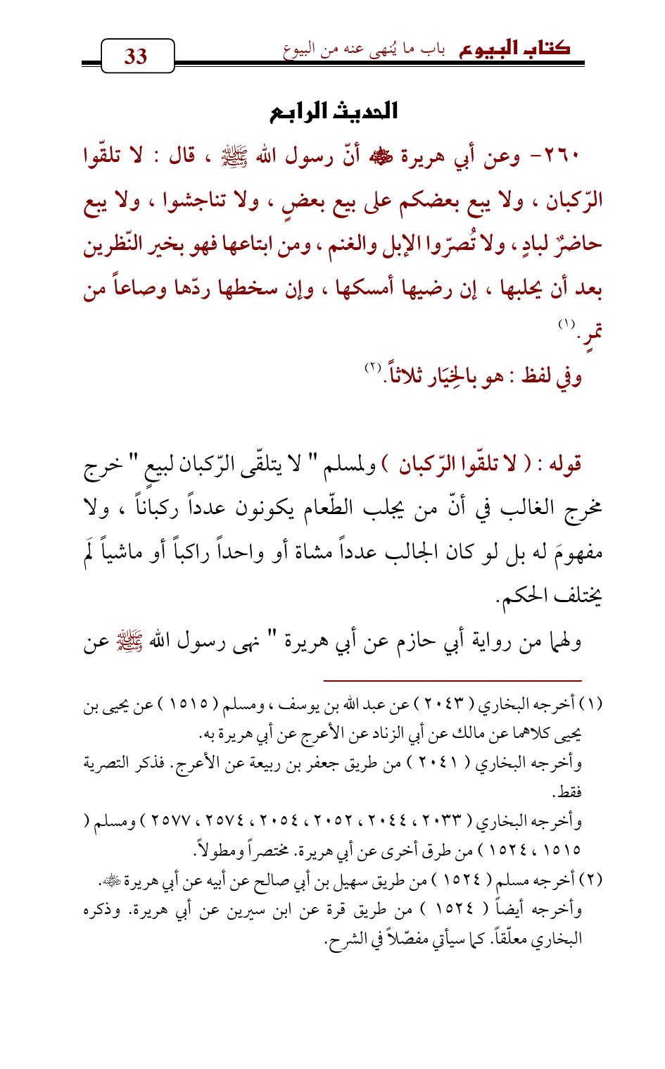 260 - وعن أبي هريرة - رضي الله عنه - أنّ رسول الله - صلى الله عليه وسلم - , قال: لا تلقّوا الرّكبان، ولا يبع بعضكم على بيع بعضٍ، ولا تناجشوا، ولا يبع حاضرٌ لبادٍ، ولا تُصرّوا الإبل والغنم، ومن ابتاعها فهو بخير النّظرين بعد أن يحلبها، إن رضيها أمسكها، وإن سخطها ردّها وصاعاً من تمرٍ. (¬1)