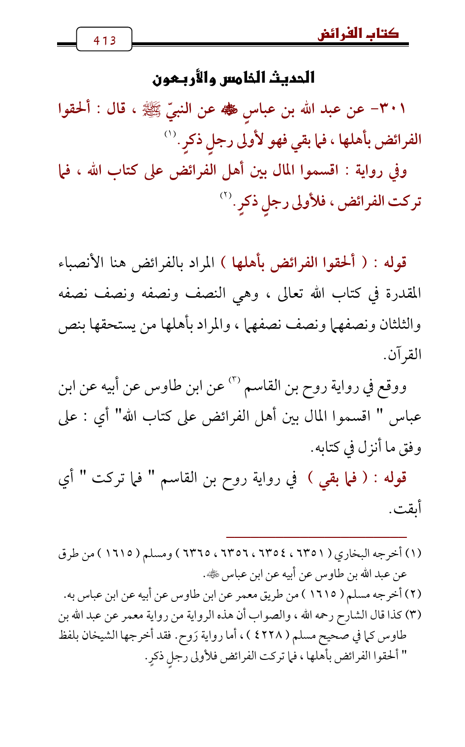 301 - عن عبد الله بن عباسٍ - رضي الله عنه - عن النبيّ - صلى الله عليه وسلم - , قال: ألحقوا الفرائض بأهلها، فما بقي فهو لأولى رجلٍ ذكرٍ. (¬1)