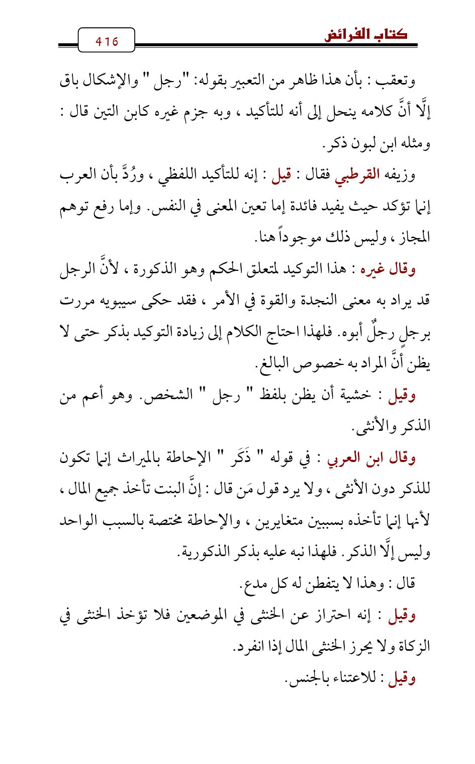 وقال غيره: هذا التوكيد لمتعلق الحكم وهو الذكورة، لأنَّ الرجل قد يراد به معنى النجدة والقوة في الأمر، فقد حكى سيبويه مررت برجلٍ رجلٌ أبوه. فلهذا احتاج الكلام إلى زيادة التوكيد بذكر حتى لا يظن أنَّ المراد به خصوص البالغ.