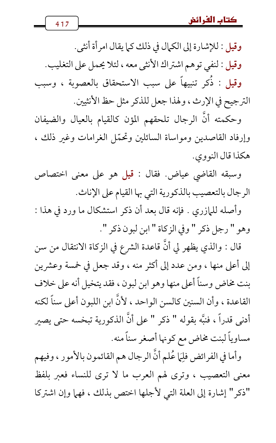 وأما في الفرائض فلِمَا عُلم أنَّ الرجال هم القائمون بالأمور , وفيهم معنى التعصيب , وترى لهم العرب ما لا ترى للنساء فعبر بلفظ " ذكر " إشارة إلى العلة التي لأجلها اختص بذلك، فهما وإن اشتركا