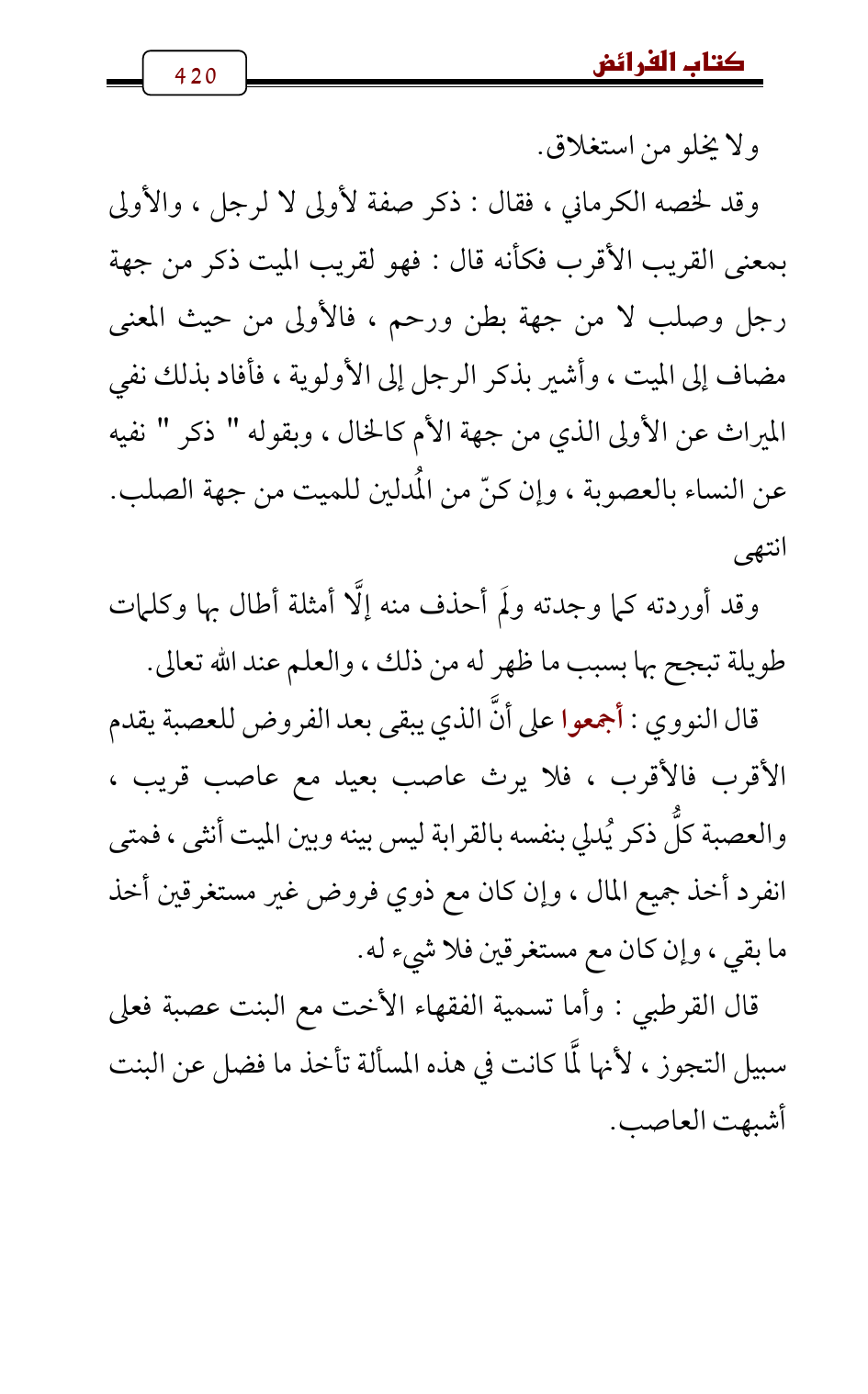 وقد لخصه الكرماني , فقال: ذكر صفة لأولى لا لرجل، والأولى بمعنى القريب الأقرب فكأنه قال: فهو لقريب الميت ذكر من جهة رجل وصلب لا من جهة بطن ورحم، فالأولى من حيث المعنى مضاف إلى الميت، وأشير بذكر الرجل إلى الأولوية , فأفاد بذلك نفي الميراث عن الأولى الذي من جهة الأم كالخال، وبقوله " ذكر " نفيه عن النساء بالعصوبة , وإن كنّ من المُدلين للميت من جهة الصلب. انتهى