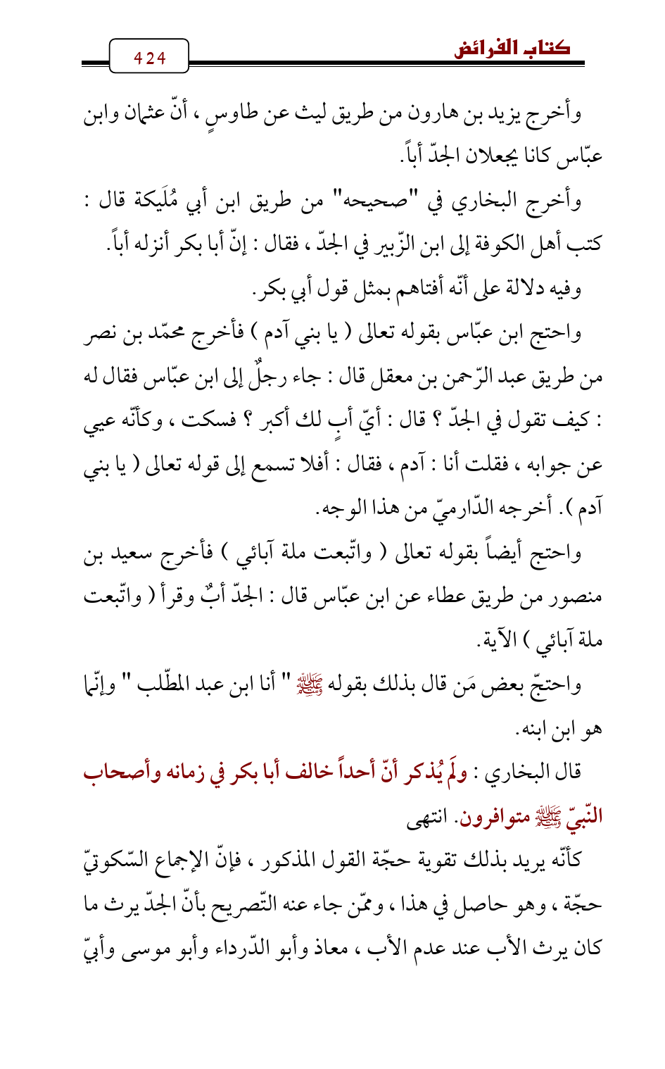 واحتج أيضاً بقوله تعالى (واتّبعت ملة آبائي) فأخرج سعيد بن منصور من طريق عطاء عن ابن عبّاس قال: الجدّ أبٌ وقرأ (واتّبعت ملة آبائي) الآية.