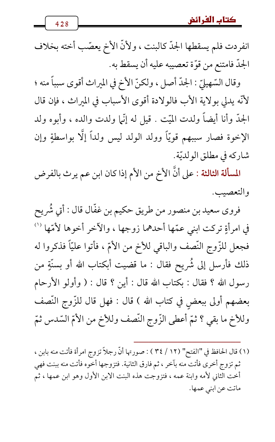 فروى سعيد بن منصور من طريق حكيم بن غفّال قال: أتي شُريح في امرأةٍ تركت ابني عمّها أحدهما زوجها، والآخر أخوها لأمّها (¬1) فجعل للزّوج النّصف والباقي للأخ من الأمّ، فأتوا عليّاً فذكروا له ذلك فأرسل إلى شُريح فقال: ما قضيت أبكتاب الله أو بسنّةٍ من رسول الله؟ فقال: بكتاب الله قال: أين؟ قال: (وأولو الأرحام بعضهم أولى ببعضٍ في كتاب الله) قال: فهل قال للزّوج النّصف وللأخ ما بقي؟ ثمّ أعطى الزّوج النّصف وللأخ من الأمّ السّدس ثمّ
