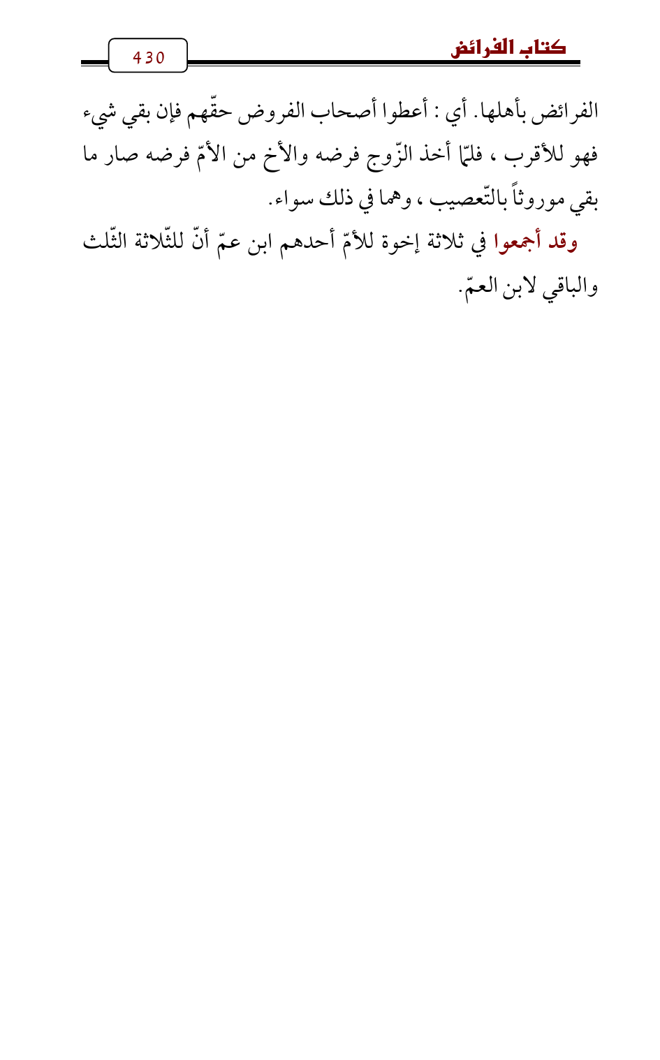 وقد أجمعوا في ثلاثة إخوة للأمّ أحدهم ابن عمّ أنّ للثّلاثة الثّلث والباقي لابن العمّ.