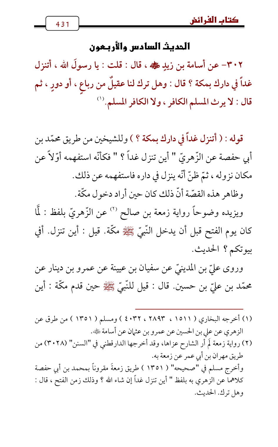 302 - عن أسامة بن زيدٍ - رضي الله عنه - , قال: قلت: يا رسولَ الله، أتنزل غداً في دارك بمكة؟ قال: وهل ترك لنا عقيلٌ من رباعٍ، أو دورٍ، ثم قال: لا يرث المسلم الكافر، ولا الكافر المسلم. (¬1)
