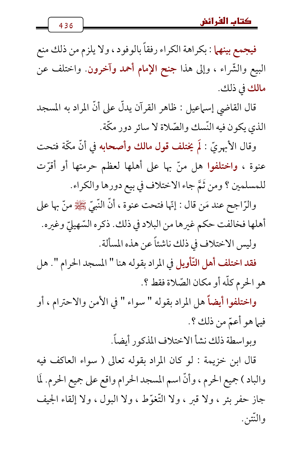 قال ابن خزيمة: لو كان المراد بقوله تعالى (سواء العاكف فيه والباد) جميع الحرم , وأنّ اسم المسجد الحرام واقع على جميع الحرم. لَمَا جاز حفر بئر , ولا قبر , ولا التّغوّط , ولا البول , ولا إلقاء الجيف والنّتن.