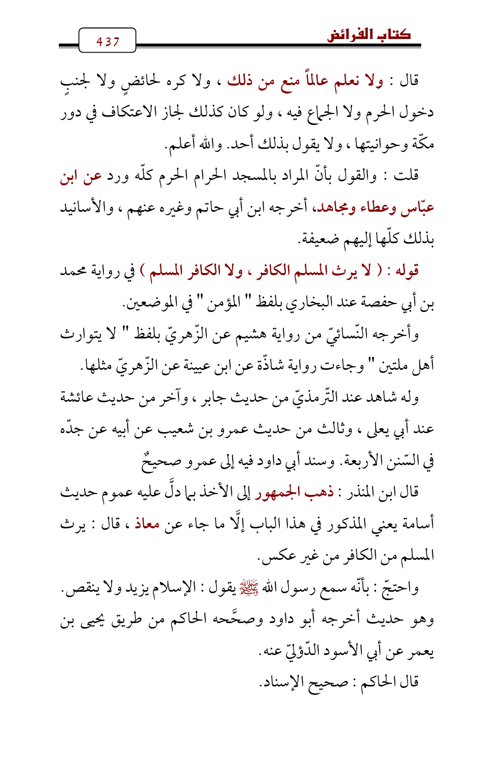 قال ابن المنذر: ذهب الجمهور إلى الأخذ بما دلَّ عليه عموم حديث أسامة يعني المذكور في هذا الباب إلَّا ما جاء عن معاذ , قال: يرث المسلم من الكافر من غير عكس.