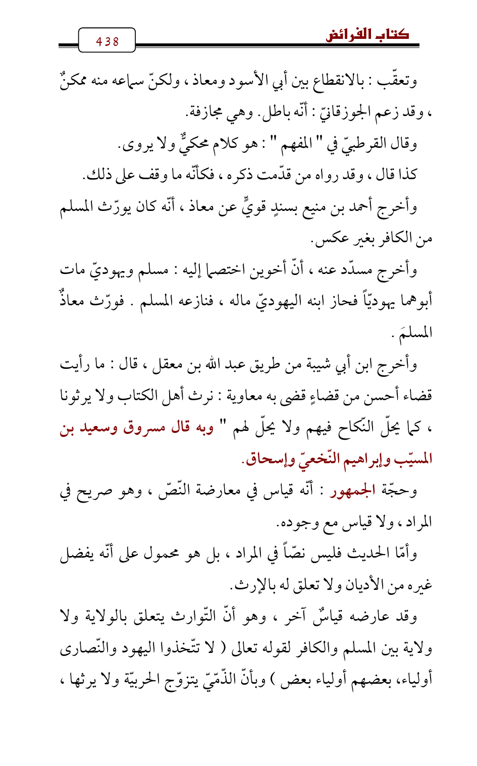 وأخرج ابن أبي شيبة من طريق عبد الله بن معقل , قال: ما رأيت قضاء أحسن من قضاءٍ قضى به معاوية: نرث أهل الكتاب ولا يرثونا، كما يحلّ النّكاح فيهم ولا يحلّ لهم " وبه قال مسروق وسعيد بن المسيّب وإبراهيم النّخعيّ وإسحاق.