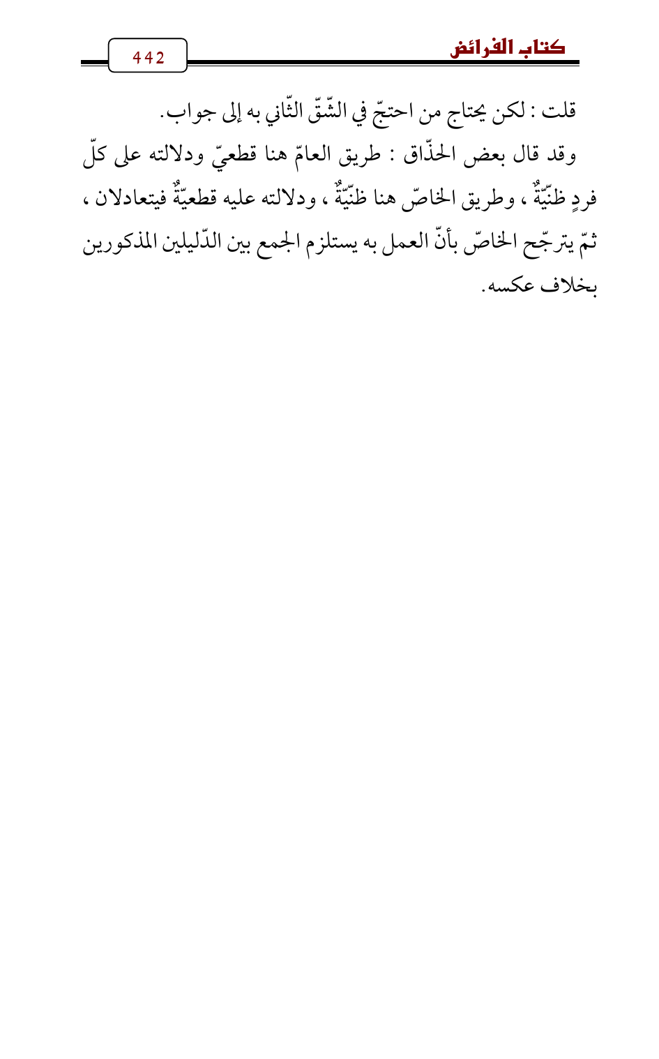 وقد قال بعض الحذّاق: طريق العامّ هنا قطعيّ ودلالته على كلّ فردٍ ظنّيّةٌ , وطريق الخاصّ هنا ظنّيّةٌ , ودلالته عليه قطعيّةٌ فيتعادلان، ثمّ يترجّح الخاصّ بأنّ العمل به يستلزم الجمع بين الدّليلين المذكورين بخلاف عكسه.