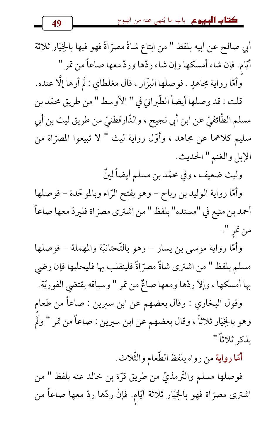 أبي صالح عن أبيه بلفظ " من ابتاع شاةً مصرّاةً فهو فيها بالخِيَار ثلاثة أيّامٍ. فإن شاء أمسكها وإن شاء ردّها وردّ معها صاعاً من تمر "