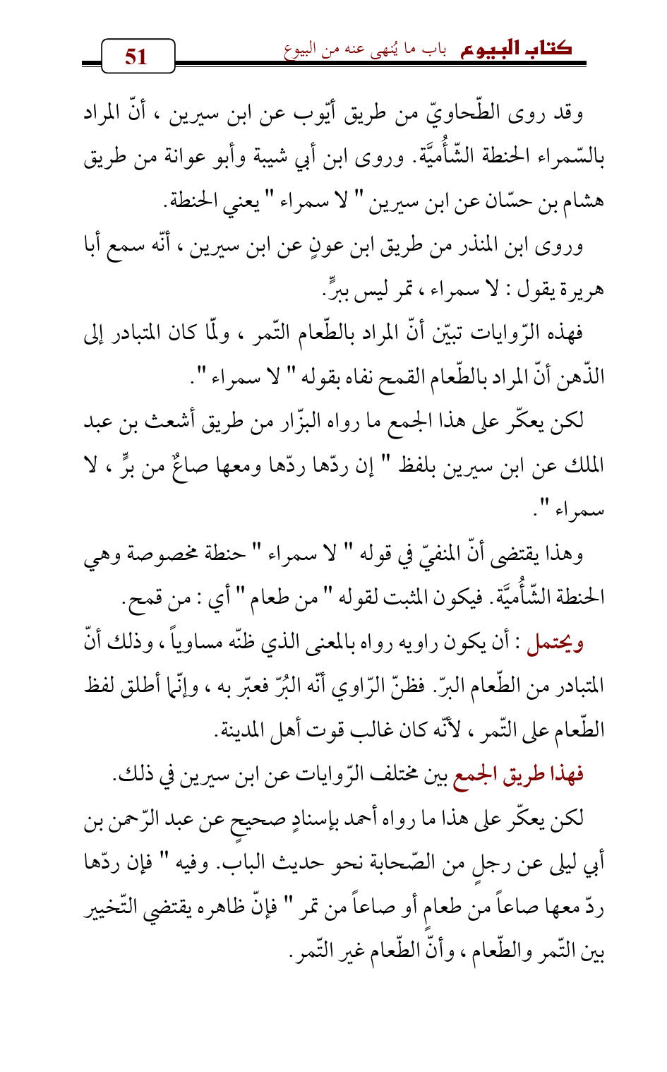 وقد روى الطّحاويّ من طريق أيّوب عن ابن سيرين , أنّ المراد بالسّمراء الحنطة الشّأُميَّة. وروى ابن أبي شيبة وأبو عوانة من طريق هشام بن حسّان عن ابن سيرين " لا سمراء " يعني الحنطة.