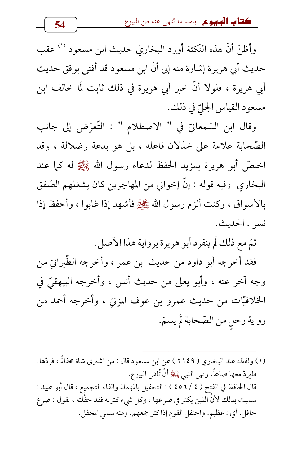 (¬1) ولفظه عند البخاري (2149) عن ابن مسعود قال: من اشترى شاة محفلةً، فردّها. فليردّ معها صاعاً. ونهى النبي - صلى الله عليه وسلم - أنْ تُلقى البيوع.