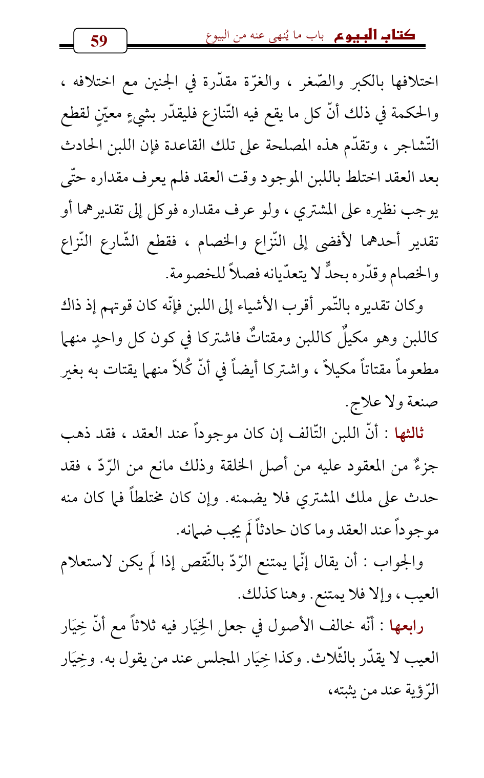ثالثها: أنّ اللبن التّالف إن كان موجوداً عند العقد , فقد ذهب جزءٌ من المعقود عليه من أصل الخلقة وذلك مانع من الرّدّ , فقد حدث على ملك المشتري فلا يضمنه. وإن كان مختلطاً فما كان منه موجوداً عند العقد وما كان حادثاً لَم يجب ضمانه.