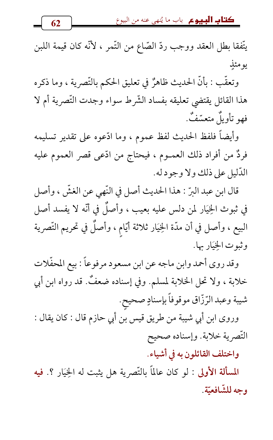 وتعقّب: بأنّ الحديث ظاهرٌ في تعليق الحكم بالتّصرية، وما ذكره هذا القائل يقتضي تعليقه بفساد الشّرط سواء وجدت التّصرية أم لا فهو تأويلٌ متعسّفٌ.
