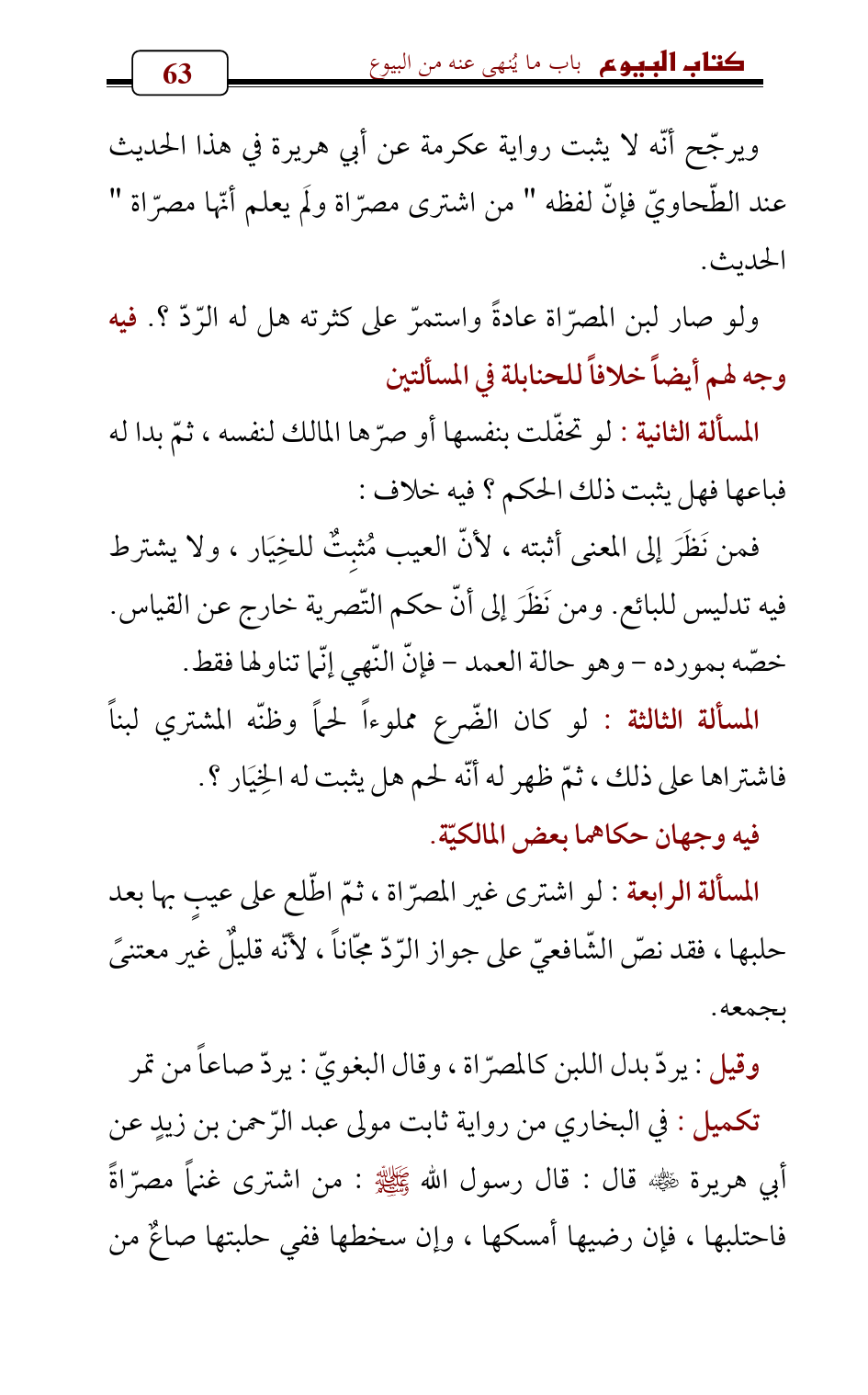 تكميل: في البخاري من رواية ثابت مولى عبد الرّحمن بن زيدٍ عن أبي هريرة - رضي الله عنه - قال: قال رسول الله - صلى الله عليه وسلم -: من اشترى غنماً مصرّاةً فاحتلبها، فإن رضيها أمسكها، وإن سخطها ففي حلبتها صاعٌ من