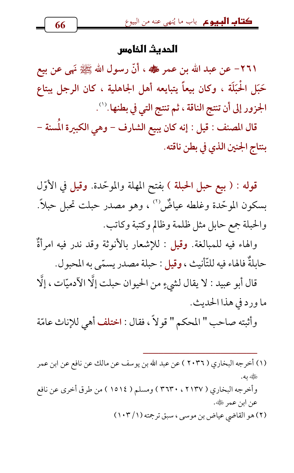 261 - عن عبد الله بن عمر - رضي الله عنه - , أنّ رسول الله - صلى الله عليه وسلم - نَهى عن بيع حَبَل الْحبَلَة، وكان بيعاً يتبايعه أهل الجاهلية، كان الرجل يبتاع الجزور إلى أن تنتج الناقة، ثم تنتج التي في بطنها. (¬1).