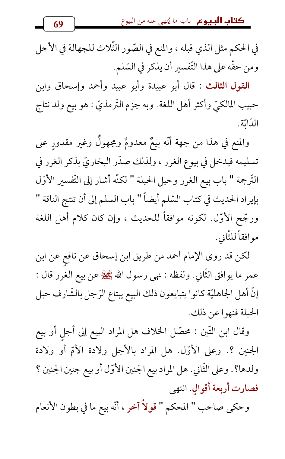 القول الثالث: قال أبو عبيدة وأبو عبيد وأحمد وإسحاق وابن حبيب المالكيّ وأكثر أهل اللغة. وبه جزم التّرمذيّ: هو بيع ولد نتاج الدّابّة.