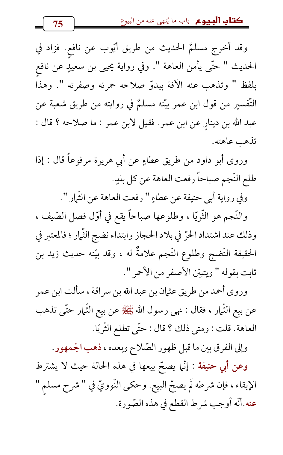 وقد أخرج مسلمٌ الحديث من طريق أيّوب عن نافعٍ. فزاد في الحديث " حتّى يأمن العاهة ". وفي رواية يحيى بن سعيدٍ عن نافعٍ بلفظ " وتذهب عنه الآفة ببدوّ صلاحه حمرته وصفرته ". وهذا التّفسير من قول ابن عمر بيّنه مسلمٌ في روايته من طريق شعبة عن عبد الله بن دينارٍ عن ابن عمر. فقيل لابن عمر: ما صلاحه؟ قال: تذهب عاهته.