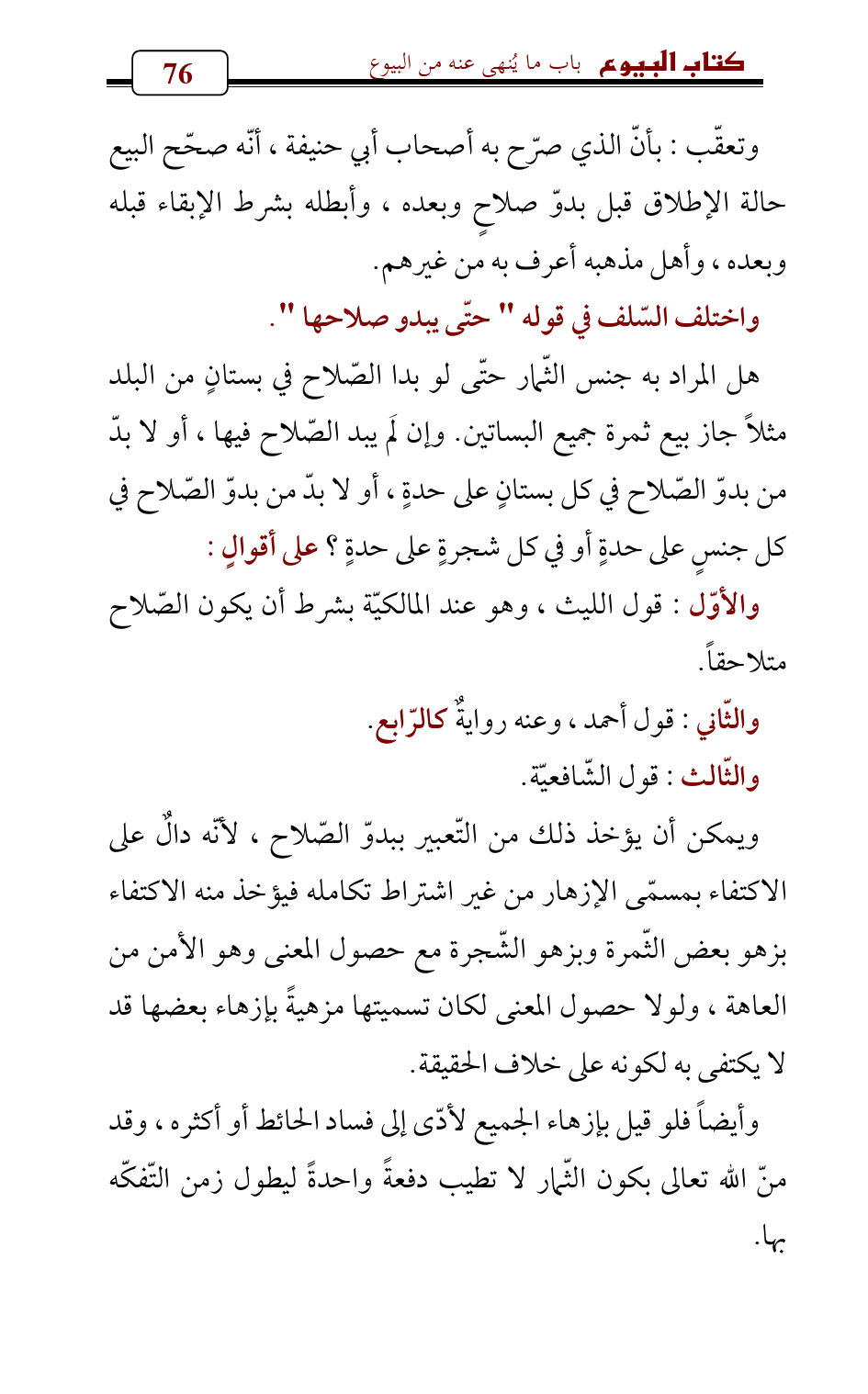 وتعقّب: بأنّ الذي صرّح به أصحاب أبي حنيفة , أنّه صحّح البيع حالة الإطلاق قبل بدوّ صلاحٍ وبعده، وأبطله بشرط الإبقاء قبله وبعده، وأهل مذهبه أعرف به من غيرهم.