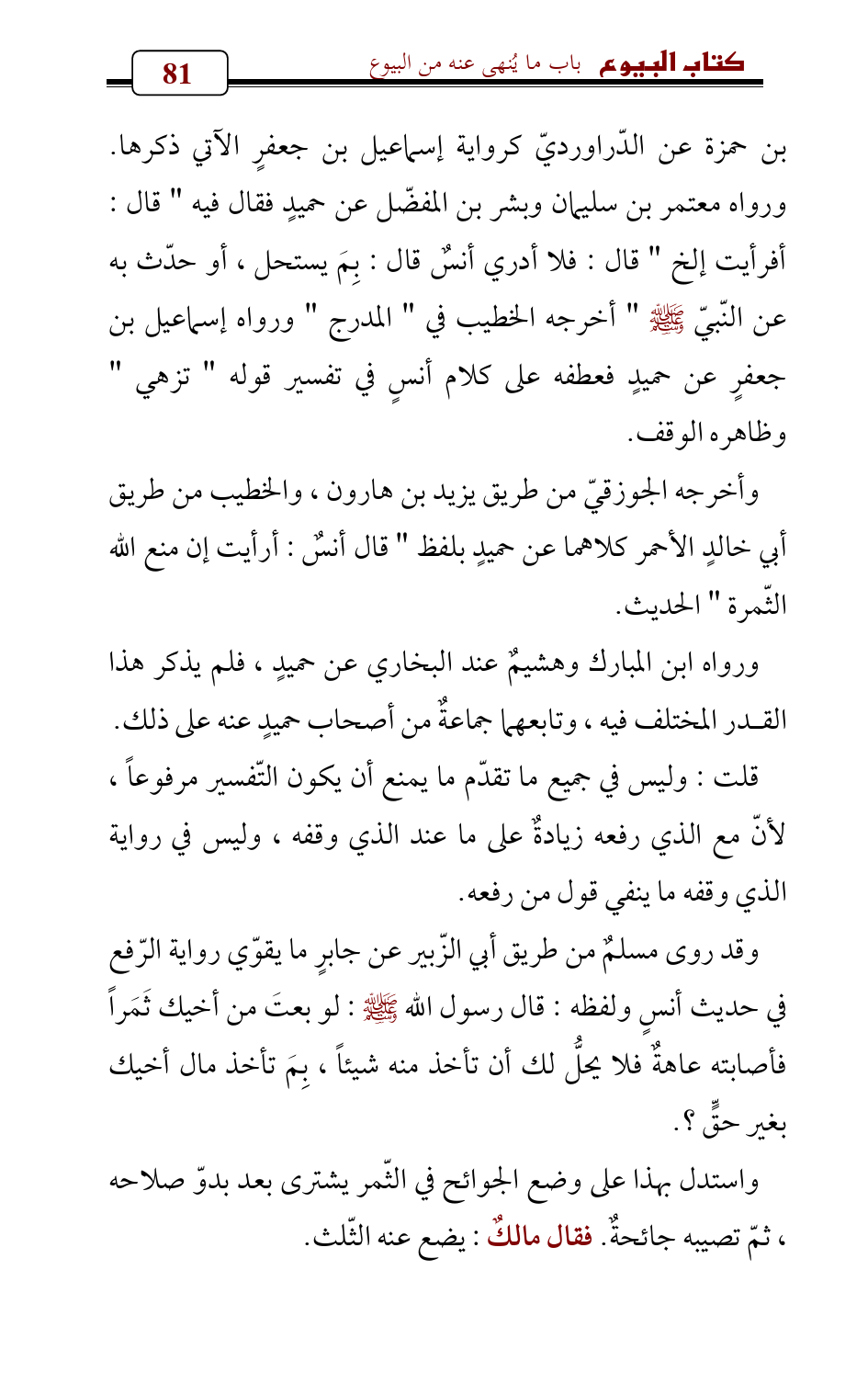 وقد روى مسلمٌ من طريق أبي الزّبير عن جابرٍ ما يقوّي رواية الرّفع في حديث أنسٍ ولفظه: قال رسول الله - صلى الله عليه وسلم -: لو بعتَ من أخيك ثَمَراً فأصابته عاهةٌ فلا يحلُّ لك أن تأخذ منه شيئاً، بِمَ تأخذ مال أخيك بغير حقٍّ؟.