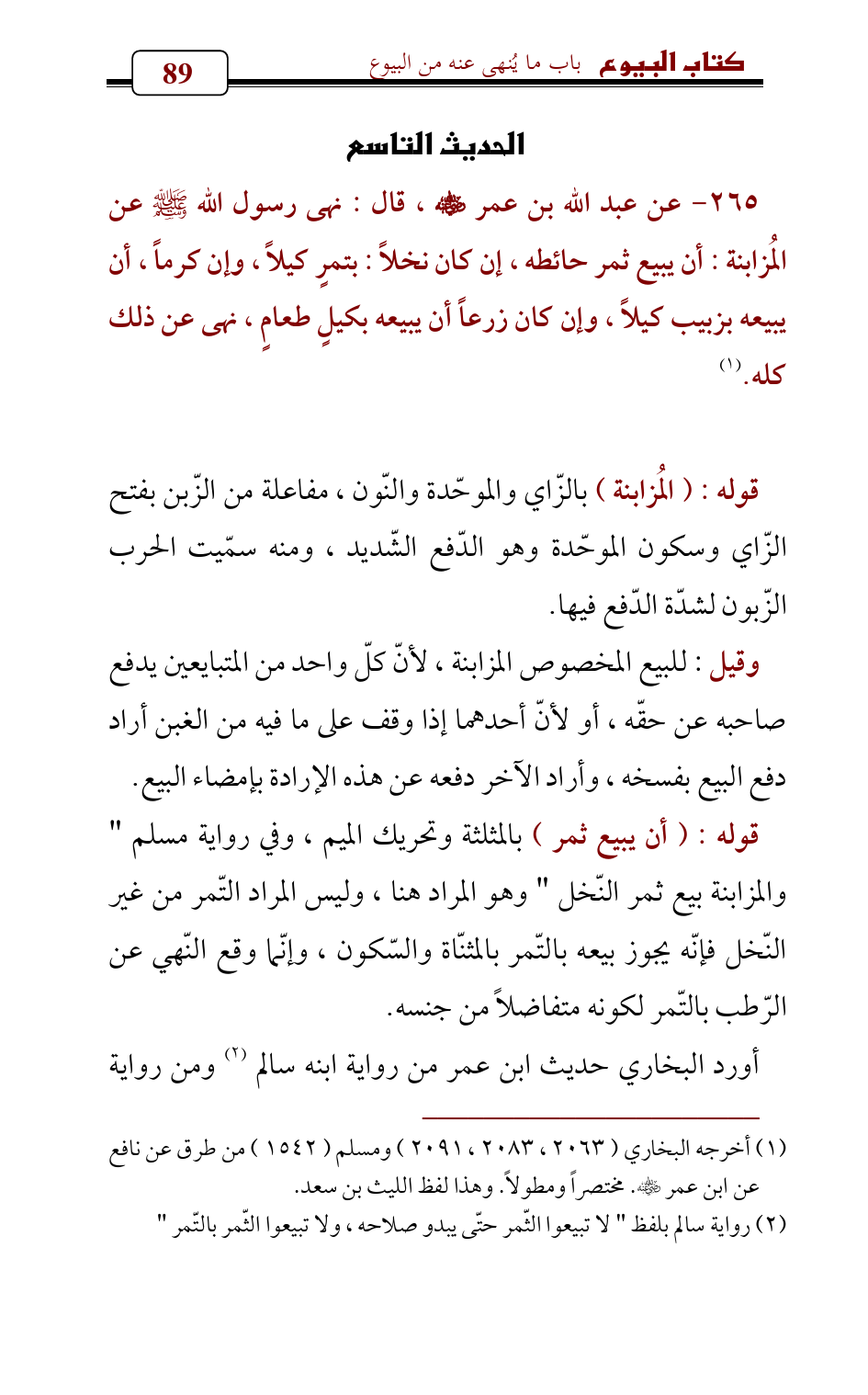 265 - عن عبد الله بن عمر - رضي الله عنه - , قال: نهى رسول الله - صلى الله عليه وسلم - عن المُزابنة: أن يبيع ثمر حائطه، إن كان نخلاً: بتمرٍ كيلاً، وإن كرماً، أن يبيعه بزبيب كيلاً، وإن كان زرعاً أن يبيعه بكيلٍ طعامٍ، نهى عن ذلك كله. (¬1)