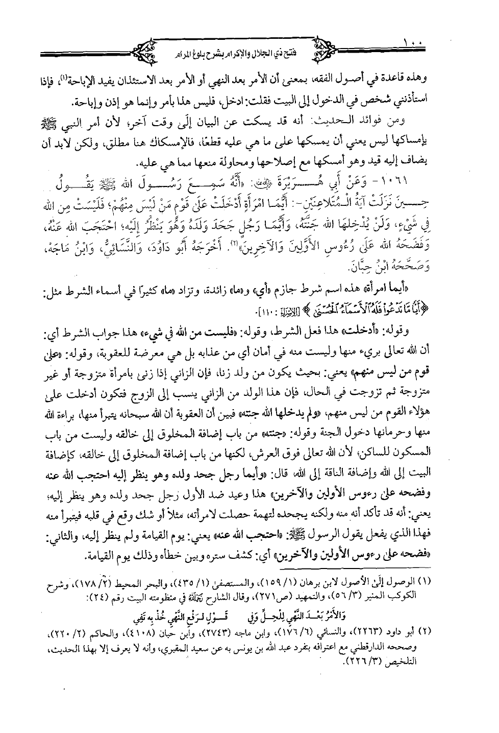 وقوله: "أدخلت" هذا فعل الشرط، وقوله: "فليست من الله في شيء" هذا جواب الشرط أي: أن الله تعالى بريء منها وليست منه في أمان أي من عذابه بل هي معرضة للعقوبة، وقوله: "على قوم من ليس منهم" يعني: بحيث يكون من ولد زنا، فإن الزاني إذا زنى بامرأة متزوجة أو غير متزوجة ثم تزوجت في الحال، فإن هذا الولد من الزاني ينسب إلى الزوج فتكون أدخلت على هؤلاء القوم من ليس منهم، "ولم يدخلها الله جنته" فبين أن العقوبة أن الله سبحانه يتبرأ منها، براءة الله منها وحرمانها دخول الجنة وقوله: "جنته" من باب إضافة المخلوق إلى خالقه وليست من باب المسكون للساكن؛ لأن الله تعالى فوق العرض، لكنها من باب إضافة المخلوق إلى خالقه، كإضافة البيت إلى الله وإضافة الناقة إلى الله، قال: "وأيما رجل جحد ولده وهو ينظر إليه احتجب الله عنه وفضحه على رءوس الأولين والآخرين" هذا وعيد ضد الأول رجل جحد ولده وهو ينظر إليه؛ يعني: أنه قد تأكد أنه منه ولكنه يجحده لتهمة حصلت لامرأته، مثلًا أو شك وقع في قلبه فيتبرأ منه فهذا الذي يفعل يقول الرسول صلى الله عليه وسلم: "احتجب الله عنه" يعني: يوم القيامة ولم ينظر إليه، والثاني: "فضحه على رءوس الأولين والآخرين" أي: كشف ستره وبين خطأه وذلك يوم القيامة.