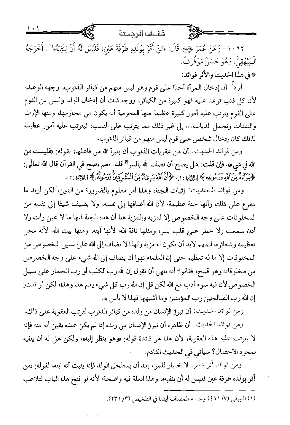 1062 - وعن عمر رضي الله عنه قال: "من أقرَّ بولده طرفة عين؛ فليس له أن ينفيه". أخرجه البيهقي، وهو حسنٌ موقوفٌ.