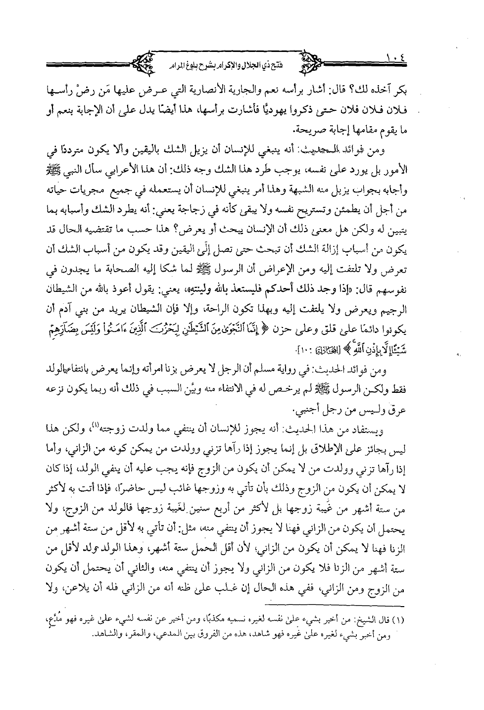 ومن فوائد الحديث: أنه ينبغي للإنسان أن يزيل الشك باليقين وألا يكون مترددًا في الأمور بل يورد على نفسه، يوجب طرد هذا الشك وجه ذلك: أن هذا الأعرابي سأل النبي صلى الله عليه وسلم وأجابه بجواب يزيل منه الشبهة وهذا أمر ينبغي للإنسان أن يستعمله في جميع مجريات حياته من أجل أن يطمئن وتستريح نفسه ولا يبقي كأنه في زجاجة يعني: أنه يطرد الشك وأسبابه بما يتبين له ولكن هل معنى ذلك أن الإنسان يبحث أو يعرض؟ هذا حسب ما تقتضيه الحال قد يكون من أسباب إزالة الشك أن تبحث حتى تصل إلى اليقين وقد يكون من أسباب الشك أن تعرض ولا تلتفت إليه ومن الإعراض أن الرسول صلى الله عليه وسلم لما شكا إليه الصحابة ما يجدون في نفوسهم قال: "إذا وجد ذلك أحدكم فليستعذ بالله ولينته" يعني: يقول أعوذ بالله من الشيطان الرجيم ويعرض ولا يلتفت إليه وبهذا تكون الراحة؛ وإلا فإن الشيطان يريد من بني آدم أن يكونوا دائما على قلق وعلى حزن {إنما النجوى من الشيطن ليحزن الذين ءامنوا وليس بضآرهم شيئًا إلا بإذن الله} [المجادلة: 10].