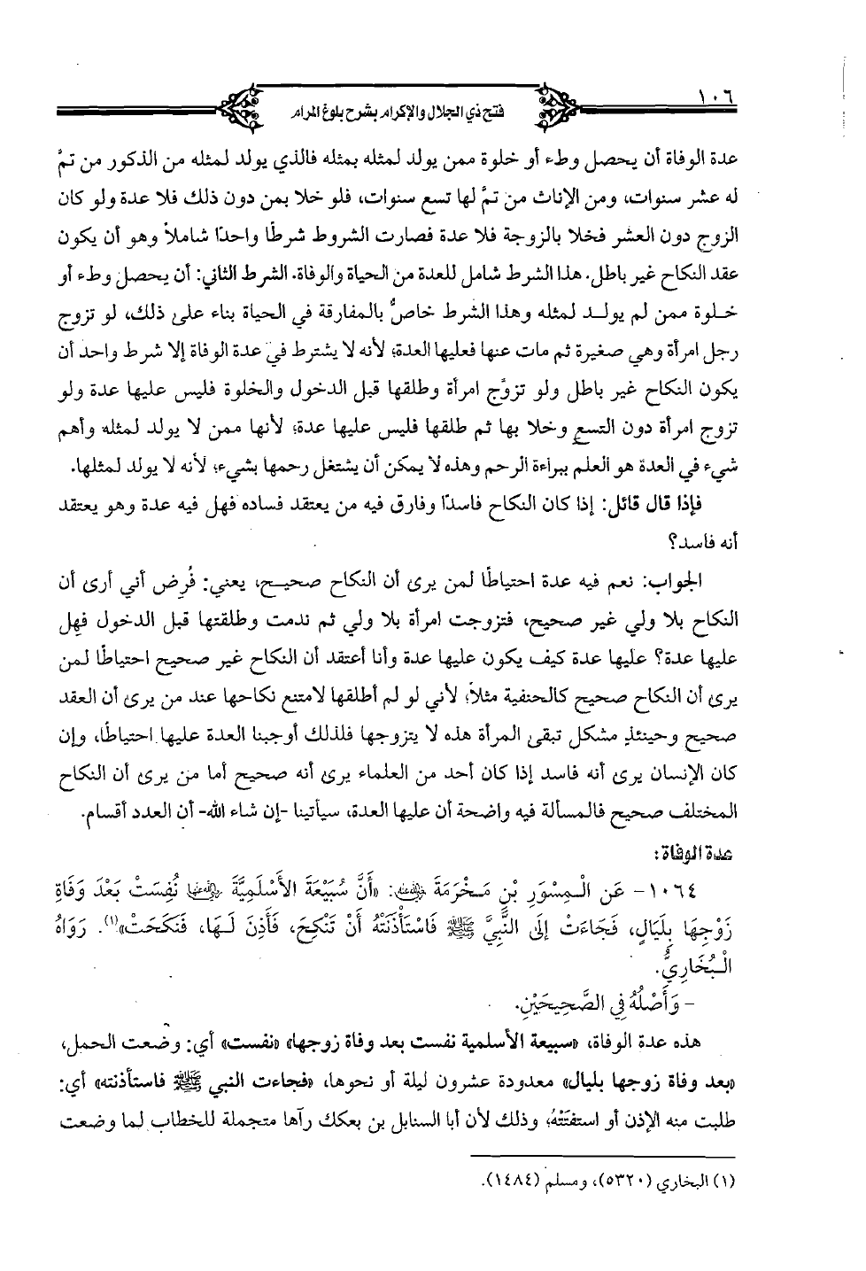 1064 - عن المسور بن مخرمة رضي الله عنه: "أنَّ سبيعة الأسلميَّة رضي الله عنها نفست بعد وفاة زوجها بليالٍ، فجاءت إلى النَّبيَّ صلى الله عليه وسلم فاستأذنته أن تنكح، فأذن لها، فنكحت". رواه البخاريُّ.