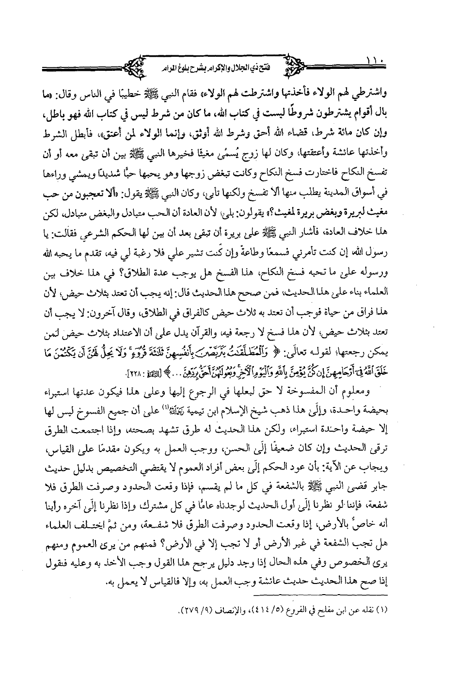 واشترطي لهم الولاء فأخذتها واشترطت لهم الولاء" فقام النبي صلى الله عليه وسلم خطيبًا في الناس وقال: "ما بال أقوام يشترطون شروطًا ليست في كتاب الله، ما كان من شرط ليس في كتاب الله فهو باطل، وإن كان مائة شرط، قضاء الله أحق وشرط الله أوثق، وإنما الولاء لمن أعتق"، فأبطل الشرط وأخذتها عائشة وأعتقها، وكان لها زوج يسمَّى مغيثًا فخيرها النبي صلى الله عليه وسلم بين أن تبقى معه أو أن تفسخ النكاح فاختارت فسخ النكاح وكانت تبغض زوجها وهو يحبها حبًّا شديدًا ويمشي وراءها في أسواق المدينة يطلب منها ألا تفسخ ولكنها تأبى، وكان النبي صلى الله عليه وسلم يقول: "ألا تعجبون من حب مغبث لبريرة وبغض بريرة لمغيث؟ " يقولون: بلى، لأن العادة أن الحب متبادل والبغض متبادل، لكن هذا خلاف العادة، فأشار النبي صلى الله عليه وسلم على بريرة أن تبقى بعد أن بين لها الحكم الشرعي فقالت: يا رسول الله، إن كنت تأمرني فسمعًا وطاعةً وإن كنت تشير علي فلا رغبة لي فيه، تقدم ما يحبه الله ورسوله على ما تحبه فسخ النكاح، هذا الفسخ هل يوجب عدة الطلاق؟ في هذا خلاف بين العلماء بناء على هذا الحديث، فمن صحح هذا الحديث قال: إنه يجب أن تعتد بثلاث حيض؛ لأن هذا فراق من حياة فوجب أن تعتد به ثلاث حيض كالفراق في الطلاق، وقال آخرون: لا يجب أن تعتد بثلاث حيض؛ لأن هذا فسخ لا رجعة فيه، والقرآن يدل على أن الاعتداد بثلاث حيض لمن يمكن رجعتها؛ لقوله تعالى: {والمطلَّقات يتربَّصن بأنفسهنَّ ثلاثة قروءٍ ولا يحلُّ لهنَّ أن يكتمن ما خلق الله في أرحامهنَّ إن كنَّ يؤمن بالله واليوم الأخر وبعولتهنَّ أحقُّ بردهن ... } [البقرة: 228].