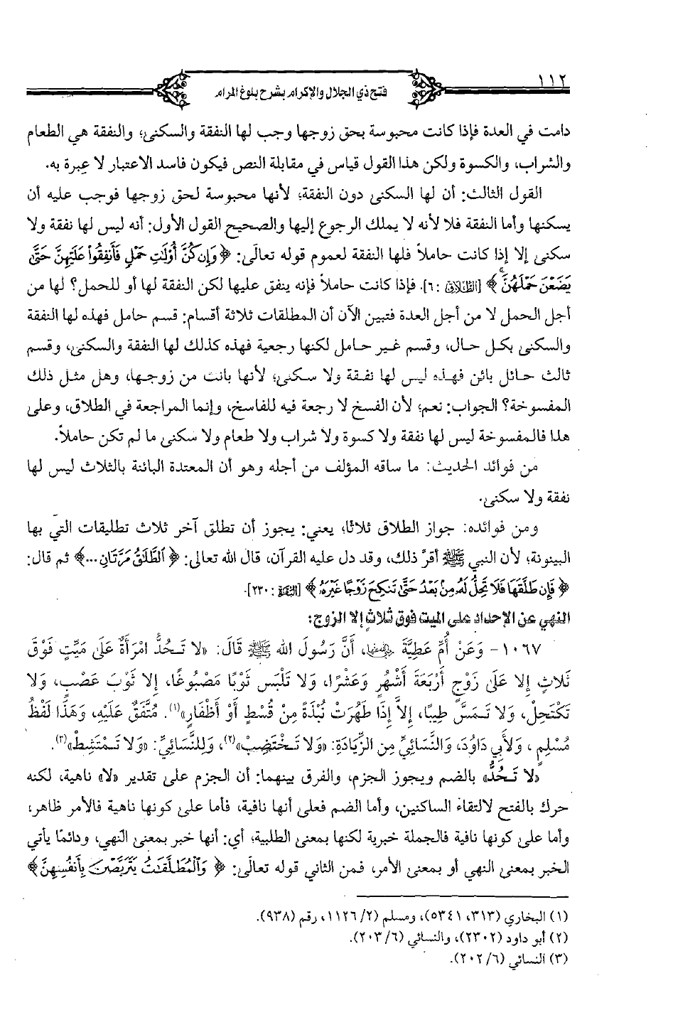 1067 - وعن أمِّ عطيَّة رضي الله عنها، أنَّ رسول الله صلى الله عليه وسلم قال: "لا تحدُّ امرأةٌ على ميِّتٍ فوق ثلاثٍ إلا على زوجٍ أربعة أشهرٍ وعشرًا، ولا تلبس ثوبًا مصبوغًا، إلا ثوب عصب، ولا تكتحل، ولا تمسَّ طيبًا، إلَّا إذا طهرت نبذةً من قسطٍ أو أظفارٍ". متَّفقٌ عليه، وهذا لفظ مسلمٍ، ولأبي داود، والنَّسائيِّ من الزِّيادة: "ولا تختضب"، وللنَّسائيِّ: "ولا تمتشط".