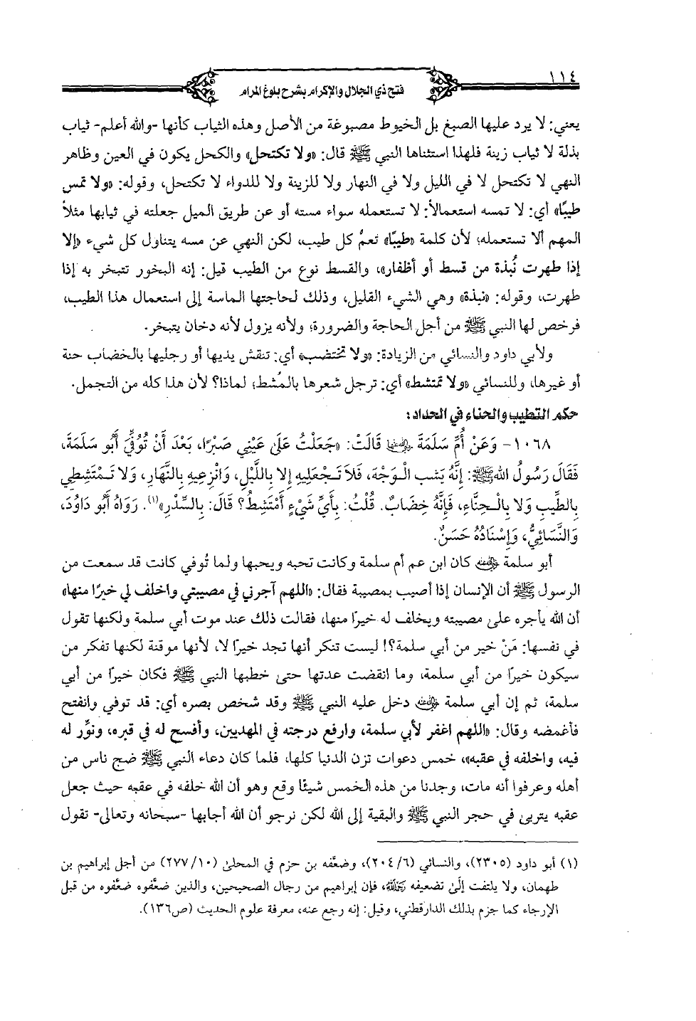 1068 - وعن أمِّ سلمة رضي الله عنها قالت: "جعلت على عيني صبرًا، بعد أن توفِّي أبو سلمة، فقال رسول الله صلى الله عليه وسلم: إنَّه يشب الوجه، فلا تجعليه إلا باللَّيل، وانزعيه بالنَّهار، ولا تمتشطي بالطِّيب ولا بالحنَّاء، فإنَّه خضابٌ. قلت: بأيِّ شيءٍ أمتشط؟ قال: بالسِّدر". رواه أبو داود، والنَّسائيُّ، وإسناده حسنٌ.