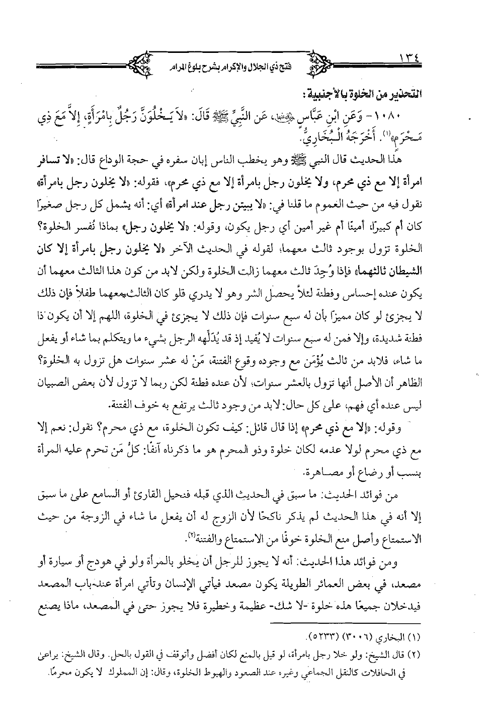 هذا الحديث قال النبي صلى الله عليه وسلم وهو يخطب الناس إبان سفره في حجة الوداع قال: "لا تسافر امرأة إلا مع ذي محرم، ولا يخلون رجل بامرأة إلا مع ذي محرم"، فقوله: "لا يخلون رجل بامرأة" نقول فيه من حيث العموم ما قلنا في: "لا يبيتن رجل عند امرأة" أي: أنه يشمل كل رجل صغيرًا كان أم كبيرًا، أمينًا أم غير أمين أي رجل يكون، وقوله: "لا يخلون رجل" بماذا نفسر الخلوة؟ الخلوة تزول بوجود ثالث معهما؛ لقوله في الحديث الآخر "لا يخلون رجل بامرأة إلا كان الشيطان ثالثهما" فإذا وجد ثالث معهما زالت الخلوة ولكن لا بد من كون هذا الثالث معهما أن يكون عنده إحساس وفطنة لئلًا يحصل الشر وهو لا يدري فلو كان الثالث معهما طفلًا فإن ذلك لا يجزئ لو كان مميزًا بأن له سبع سنوات فإن ذلك لا يجزئ في الخلوة، اللهم إلا أن يكون ذا فطنة شديدة، وإلا فمن له سبع سنوات لا يقيد إذ قد يدلِّهه الرجل بشيء ما ويتكلم بما شاء أو يفعل ما شاء، فلابد من ثالث يؤمن مع وجوده وقوع الفتنة، من له عشر سنوات هل تزول به الخلوة؟ الظاهر أن الأصل أنها تزول بالعشر سنوات؛ لأن عنده فطنة لكن ربما لا تزول لأن بعض الصبيان ليس عند أي فهم، على كل حال/ لا بد من وجود ثالث يرتفع به خوف الفتنة.