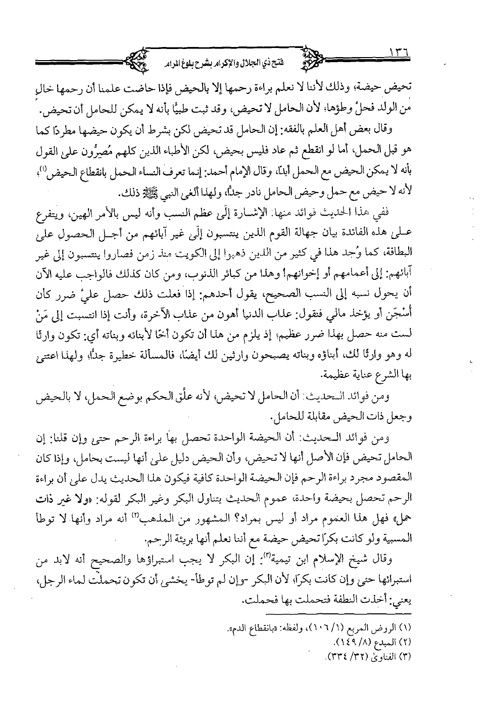 وقال بعض أهل العلم بالفقه: إن الحامل قد تحيض لكن بشرط أن يكون حيضها مطردًا كما هو قبل الحمل، أما لو انقطع ثم عاد فليس بحيض، لكن الأطباء الذين كلهم مصرُّون على القول بأنه لا يمكن الحيض مع الحمل أبدًا، وقال الإمام أحمد: إنما تعرف النساء الحمل بانقطاع الحيض؛ لأنه لا حيض مع حمل وحيض الحامل نادر جدًا، ولهذا ألغى النبي صلى الله عليه وسلم ذلك.