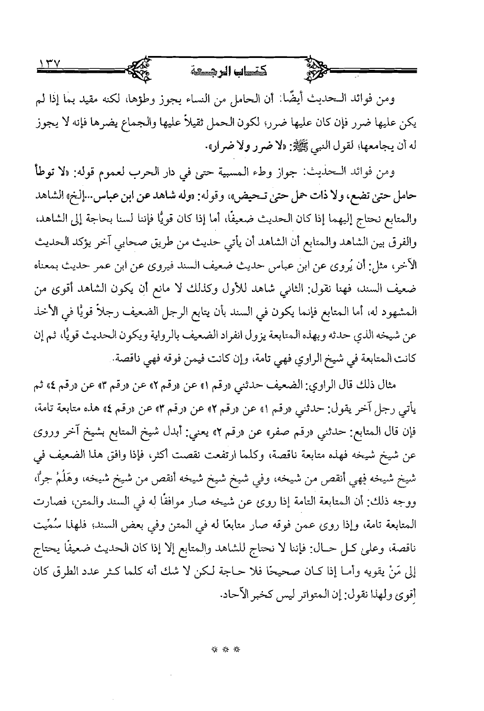مثال ذلك قال الراوي: الضعيف حدثني "رقم 1" عن "رقم 2" عن "رقم 3" عن "رقم 4" ثم يأتي رجل آخر يقول: حدثني "رقم 1" عن "رقم 2" عن "رقم 3" عن "رقم 4" هذه متابعة تامة، فإن قال المتابع: حدثني "رقم صفر" عن "رقم 2" يعني: أبدل شيخ المتابع بشيخ آخر وروى عن شيخ شيخه فهذه متابعة ناقصة، وكلما ارتفعت نقصت أكثر، فإذا وافق هذا الضعيف في شيخ شيخه فهي أنقص من شيخه، وفي شيخ شيخ شيخه أنقص من شيخ شيخه، وهلمَّ جرًّا، ووجه ذلك: أن المتابعة التامة إذا روى عن شيخه صار موافقًا في السند والمتن، فصارت المتابعة تامة، وإذا روى عمن فوقه صار متابعًا له في المتن وفي بعض السند؛ فلهذا سمِّيت ناقصة، وعلى كل حال: فإننا لا نحتاج للشاهد والمتابع إلا إذا كان الحديث ضعيفًا يحتاج إلى من يقويه وأما إذا كان صحيحًا فلا حاجة لكن لا شك أنه كلما كثر عدد الطرق كان أقوى ولهذا نقول: إن المتواتر ليس كخبر الآحاد.