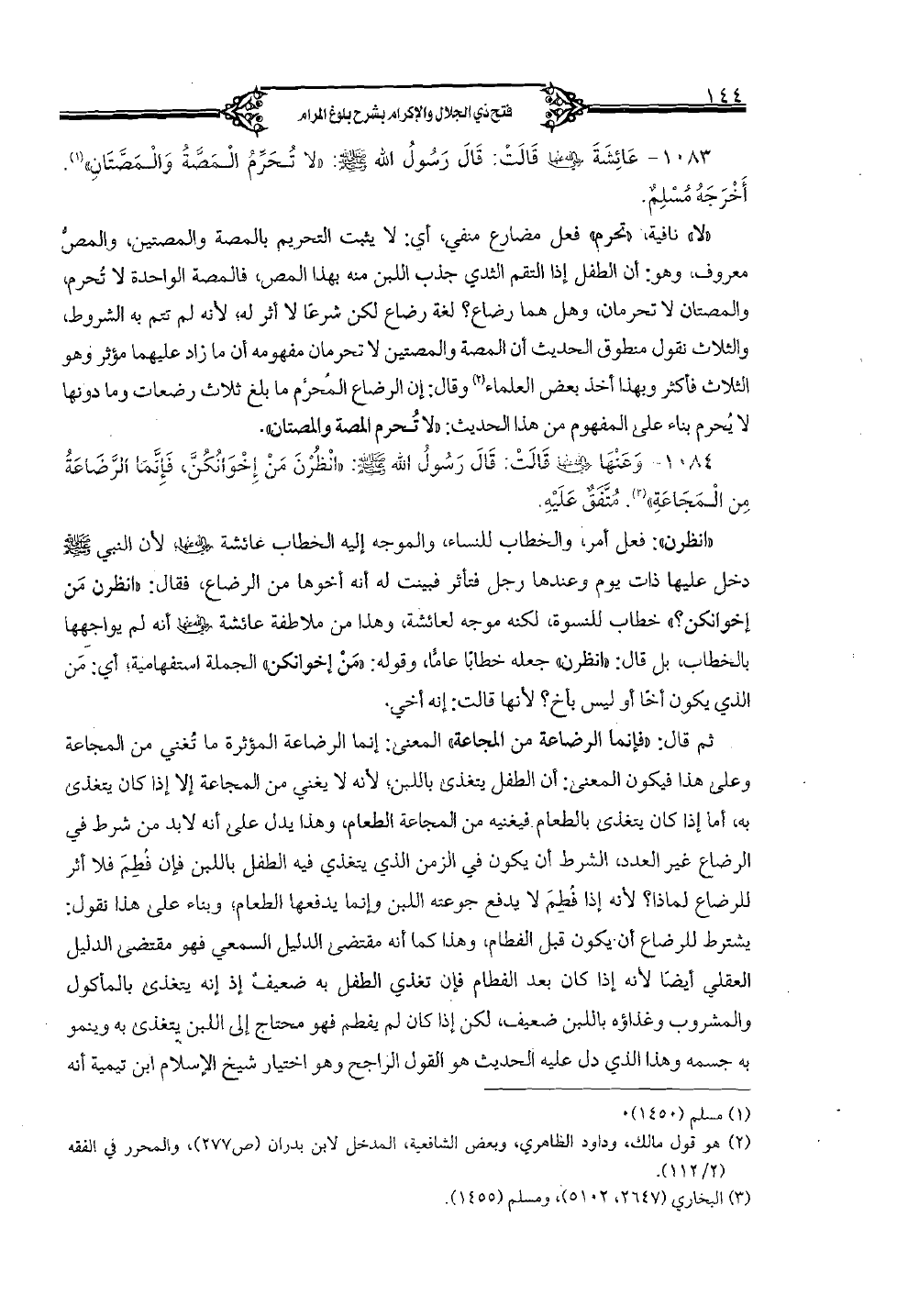 1083 - عائشة رضي الله عنها قالت: قال رسول الله صلى الله عليه وسلم: "لا تحرِّم المصَّة والمصَّتان". أخرجه مسلمٌ.