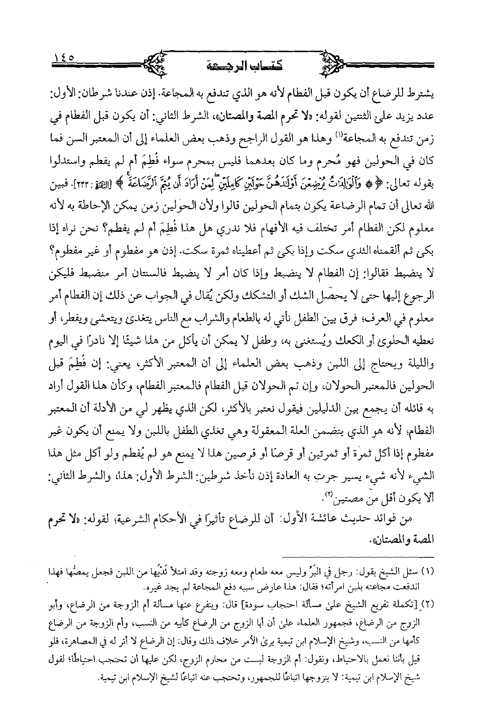 يشترط للرضاع أن يكون قبل الفطام لأنه هو الذي تندفع به المجاعة. إذن عندنا شرطان: الأول: عدد يزيد على الثنتين لقوله: "لا تحرم المصة والمصتان"، الشرط الثاني: أن يكون قبل الفطام في زمن تندفع به المجاعة وهذا هو القول الراجح وذهب بعض العلماء إلى أن المعتبر السن فما كان في الحولين فهو محرم وما كان بعدهما فليس بمحرم سواء فطم أم لم يفطم واستدلوا بقوله تعالى: {? والوالدات يرضعن أولادهن حولين كاملين لمن أراد أن يتم الرضاعة} [البقرة: 233]. فبين الله تعالى أن تمام الرضاعة يكون بتمام الحولين قالوا ولأن الحولين زمن يمكن الإحاطة به لأنه معلوم لكن الفطام أمر تختلف فيه الأفهام فلا ندري هل هذا فطم أم لم يفطم؟ نحن نراه إذا بكي ثم القمناه التدي سكت ولذا بكى ثم أعطيناه ثمرة سكت. إذن هو مفطوم أو غير مفطوم؟ لا ينضبط فقالوا: إن الفطام لا ينضبط وإذا كان أمر لا ينضبط فالسنتان أمر منضبط فليكن الرجوع إليها حتى لا يحصل الشك أو التشكك ولكن يقال في الجواب عن ذلك إن الفطام أمر معلوم في العرف؛ فرق بين الطفل نأتي له بالطعام والشراب مع الناس يتغدى ويتعشى ويفطر، أو نعطيه الحلوى أو الكعك ويستغنى به، وطفل لا يمكن أن يأكل من هذا شيئًا إلا نادرًا في اليوم والليلة ويحتاج إلى اللبن وذهب بعض العلماء إلى أن المعتبر الأكثر، يعني: إن فطم قبل الحولين فالمعتبر الحولان، وإن تم الحولان قبل الفطام فالمعتبر الفطام، وكأن هذا القول أراد به قائله أن يجمع بين الدليلين فيقول تعتبر بالأكثر، لكن الذي يظهر لي من الأدلة أن المعتبر الفطام؛ لأنه هو الذي يتضمن العلة المعقولة وهي تغذي الطفل باللبن ولا يمنع أن يكون غير مفطوم إذا أكل ثمرة أو ثمرتين أو قرصنا أو قرصين هذا لا يمنع هو لم يفطم ولو أكل مثل هذا الشيء لأنه شيء يسير جرت به العادة إذن نأخذ شرطين: الشرط الأول: هذا، والشرط الثاني: ألا يكون أقل من مصتين.
