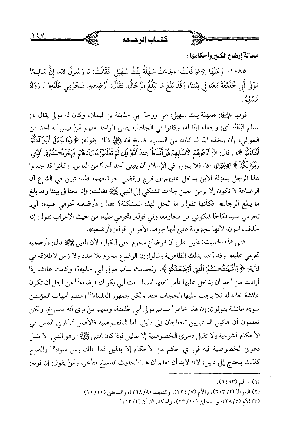 ففي هذا الحديث: دليل على أن الرضاع محرم حتى الكبار؛ لأن النبي صلى الله عليه وسلم قال: "أرضعيه تحرمي عليه"، وقد أخذ بذلك الظاهرية وقالوا: إن الرضاع محرم بلا عدد ولا زمن لإطلاقه في الآية: {وأمهاتكم الاتي أرضعنكم}، ولحديث سالم مولى أبي حذيفة، وكانت عائشة إذا أرادت من أحد أن يدخل عليها تأمر أختها أسماء بنت أبي بكر أن ترضعه من أجل أن تكون عائشة خالة له فلا يجب عليها الحجاب عنه ولكن جمهور العلماء ومنهم أمهات المؤمنين سوى عائشة يقولون: إن هذا خاصٌّ بسالم مولى أبي حذيفة، ومنهم من يرى أنه منسوخ، ولكن تعلمون أن هاتين الدعويين تحتاجان إلى دليل، أما الخصوصية فالأصل تساوي الناس في الأحكام الشرعية ولا تقبل دعوى الخصوصية إلا بدليل فإذا كان النبي صلى الله عليه وسلم- وهو النبي- لا يقبل دعوى الخصوصية فيه في أي حكم من الأحكام إلا بدليل فما بالك بمن سواه؟ ! والنسخ كذلك يحتاج إلى دليل، لأنه لا بد أن نعلم أن هذا الحديث الناسخ متأخر، ومن يقول: إن قوله:
