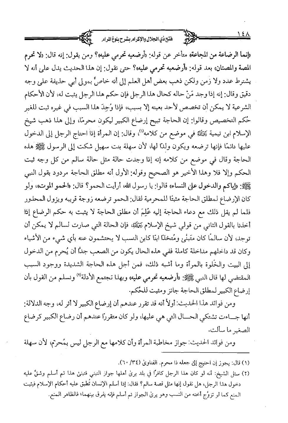 "إنما الرضاعة من المجاعة" متأخر عن قوله: "أرضعيه تحرمي عليه"؟ ومن يقول: إنه قال: "لا تحرم المصة والمصتان" بعد قوله: "أرضعيه تحرمي عليه"؟ حتى نقول: إن هذا الحديث يدل على أنه لا يشترط عدد ولا زمن ولكن ذهب بعض أهل العلم إلى أنه خاصٌّ بمولى أبي حذيفة على وجه دقيق وقال: إنه إذا وجد من حاله كحال هذا الرجل فإن حكم هذا الرجل يثبت له؛ لأن الأحكام الشرعية لا يمكن أن تخصص لأحد بعينه إلا بسبب، فإذا وجد هذا السبب في غيره ثبت للغير حكم التخصيص وقالوا: إن الحاجة تبيح إرضاع الكبير ليكون محرمًا، وإلى هذا ذهب شيخ الإسلام أبن تيمية رحمه الله في موضع من كلامه، وقال: إن المرأة إذا احتاج الرجل إلى الدخول عليها دائمًا فإنها ترضعه ويكون ولذا لها؛ لأن سهلة بنت سهيل شكت إلى الرسول صلى الله عليه وسلم هذه الحاجة وقال في موضع من كلامه إنه إذا وجدت حالة مثل حالة سالم من كل وجه ثبت الحكم وإلا فلا وهذا الأخير هو الصحيح وقوله: الأول أنه مطلق الحاجة مردود بقول النبي صلى الله عليه وسلم: "إياكم والدخول على النساء" قالوا: يا رسول الله، أرأيت الحمو؟ قال: "الحمو الموت"، ولو كان الإرضاع المطلق الحاجة مثبتًا للمحرمية لقال: الحمو ترضعه زوجة قريبه ويزول المحذور فلما لم يقل ذلك مع دعاء الحاجة إليه علم أن مطلق الحاجة لا يثبت به حكم الرضاع إذا أخذنا بالقول الثاني من قولي شيخ الإسلام رحمه الله، فإن الحالة التي صارت لسالم لا يمكن أن توجد؛ لأن سالمًا كان متبنَّى ومتخذًا ابنا كابن النسب لا يحتشمون عنه بأي شيء من الأشياء وكان قد داخلهم مداخلة كاملة ففي هذه الحال يكون من الصعب جدًّا أن يحرم من الدخول إلى البيت والخلوة بالمرأة وما أشبه ذلك، فمن أجل هذه الحاجة الشديدة ووجود السبب المقتضي لها قال النبي صلى الله عليه وسلم: "أرضعيه تحرمي عليه" وبهذا تجتمع الأدلة ونسلم من القول بأن إرضاع الكبير لمطلق الحاجة جائز ومثبت للحكم.