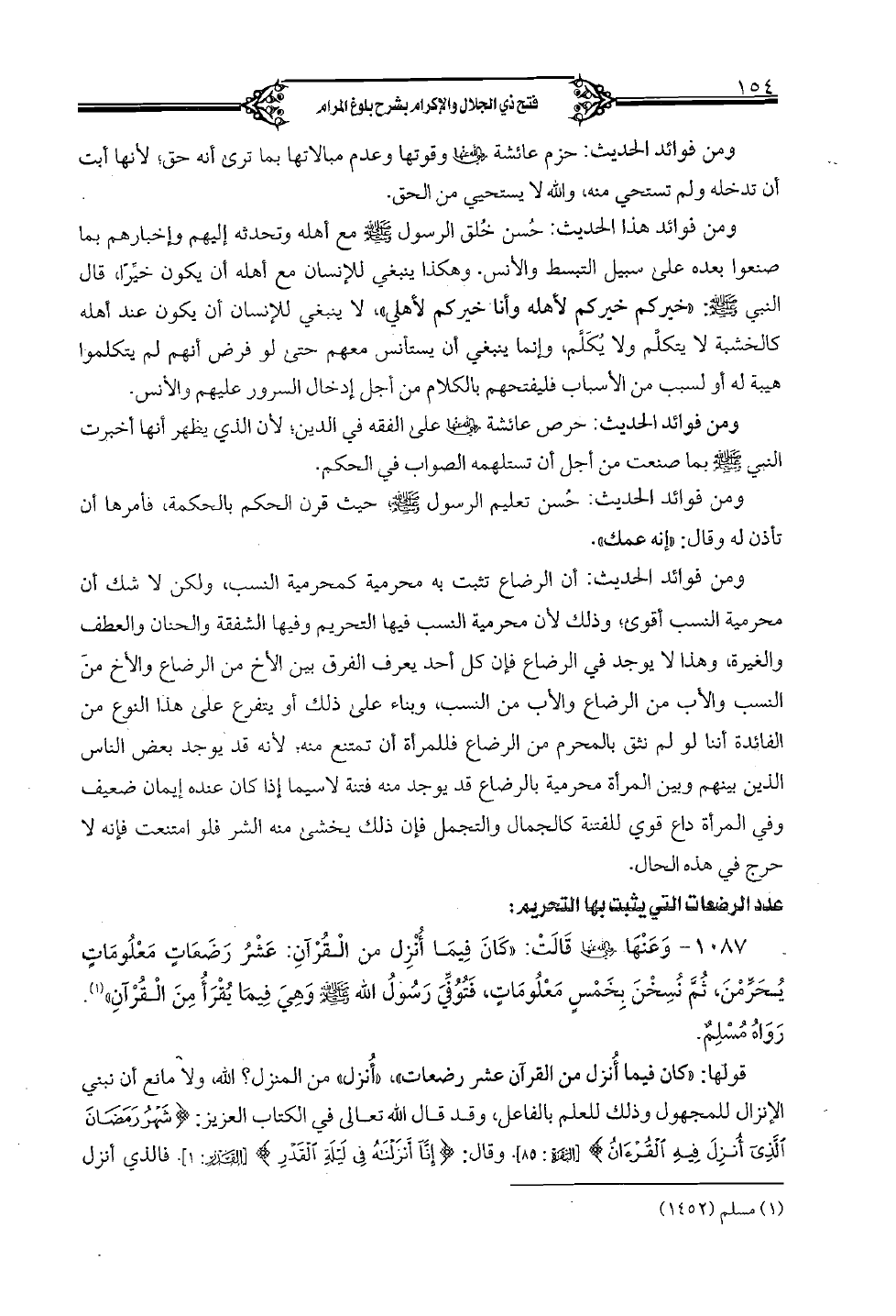 1087 - وعنها رضي الله عنها قالت "كان فيما أنزل من القرآن: عشر رضعاتٍ معلوماتٍ يحرِّمن، ثمَّ نسخن بخمسٍ معلوماتٍ، فتوفِّي رسول الله صلى الله عليه وسلم وهي فيما يقرأ من القرآن". رواه مسلمٌ.