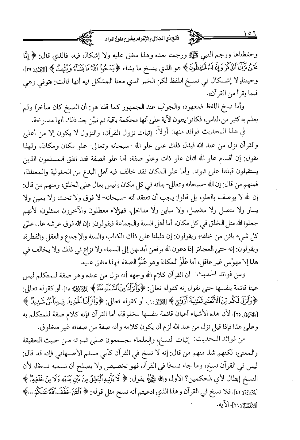 ومن فوائد بنفسها حتى نقول إنه كقوله تعالى: {وأنزلنا من السَّماء ماء} (المؤمنون: 18). او كقوله تعالى: {وأنزل لم من الأنعم ثمنية أزوج} (الزمر: 6). أو كقوله تعالى: {وأنزلنا الحديد فيه بأس شديدٌ} (الحديد: 25). لأن هذه الأشياء أعيان قائمة بنفسها مخلوقة، أما القرآن فإنه كلام صفة للمتكلم به وعلى هذا فإذا قيل نزل من عند الله لزم أن يكون كلامه وأنه صفة من صفاته غير مخلوق.