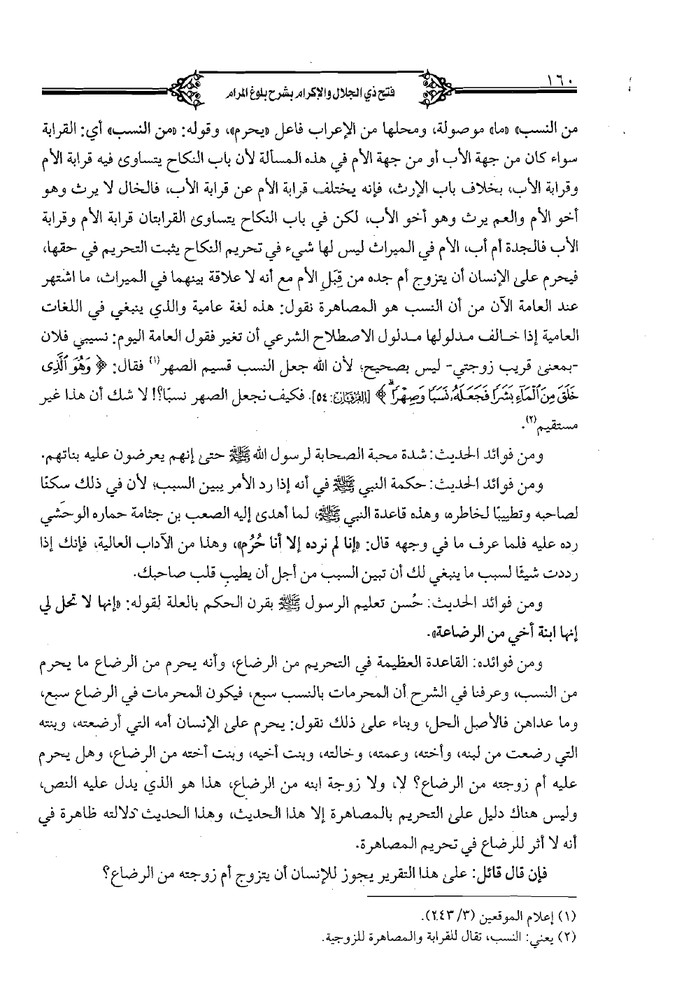 من النسب" "ما" موصولة، ومحلها من الإعراب فاعل "يحرم"، قوله "من النسب" أي: القرابة سواء كان من جهة الأب أو من جهة الأم في هذه المسألة لان باب النكاح يتساوى فيه قرابة الأم وقرابة الأب، بخلاف باب الإرث، فإنه يختلف قرابة الأم عن قرابة الأب، فالخال لا يرث وهو أخو الأم والعم يرث وهو أخو الأب، لكن في باب النكاح يتساوى القرابتان قرابة الأم وقرابة الأب فالجدة أم أب، الأم في الميراث ليس لها شيء في تحريم النكاح يثبت التحريم في حقها، فيحرم على الإنسان أن يتزوج أم جده من قبل الأم مع أنه لا علاقة بينهما في الميراث، ما اشتهر عند العامة الآن من أن النسب هو المصاهرة نقول: هذه لغة عامية والذي ينبغي في اللغات العامية إذا خالف مدلولها مدلول الاصطلاح الشرعي أن تغير فقول العامة اليوم: نسيبي فلان - بمعنى قريب زوجتي - ليس بصحيح؛ لأن الله جعل النسب قسيم الصهر فقال: {وهو الَّذي خلق من الماء بشرًا فجعله نسبًا وصهرًا} (الفرقان: 54). فكيف نجعل الصهر نسبًا؟ ! لا شك أن هذا غير مستقيم.