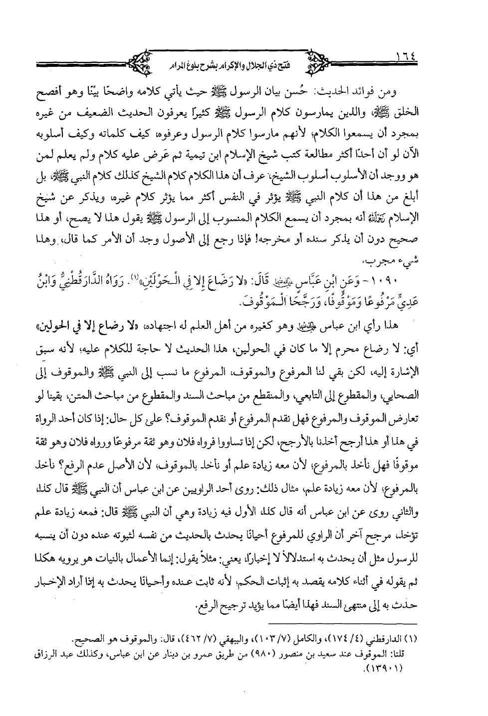 1090 - وعن ابن عبَّاس رضي الله عنهما قال: "لا رضاع إلا في الحولين". رواه الدَّارقطنيُّ وابن عديٍّ مرفوعًا وموقوفًا، ورجَّحا الموقوف.