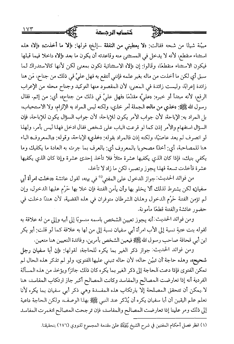 مبيَّنة شيئًا من شحه فقالت: "لا يعطيني من النفقة ... إلخ" قولها: "إلا ما أخذت" "إلا" هذه استثناء منقطع؛ لأنه لا يدخل في المستثنى منه وقاعدته أن يكون ما بعد "إلا" داخلا فيما قبلها فيكون الاستثناء منقطعًا، وقالوا: إن "إلا" الاستثنائية تكون بمعنى لكن لأنها كالاستدراك لما سبق أي لكن ما أخذت من ماله بغير علمه فإنني أنتفع به فهل علىَّ في ذبك من جناح، من هنا زائدة إعرابًا، وليست زائدة في المعنى؛ لأن المقصود منها التوكيد وجناح محله من الإعراب الرفع؛ لأنه مبتدأ أو خبره: "علي" مقدمًا "فهل عليَّ في ذلك من جناح"، أي: من إثم. فقال رسول الله صلى الله عليه وسلم: "خذي من ماله" الجملة أمر خذي، ولكنه ليس المراد به الإلزام، ولا الاستحباب، بل المراد به: الإباحة؛ لأن جواب الأمر يكون للإباحة؛ لأن جواب السؤال يكون للإباحة، فإن السؤال استفهام والأمر إذن ما لو قرعت الباب على شخص فقال ادخل فهذا ليس بأمر، ولهذا لو انصرف لم يعد عاصيًا، ولكنه إذن فالمراد بقوله: "خذي" الإباحة، وقوله: "بالمعروف" الباء هنا للمصاحبة، أي أخذا مصحوبا بالمعروف أي: بالعرف بما جرت به العادة ما يكفيك وما يكفي بنيك، فإذا كان الذي يكفيها عشرة مثلًا فلا تأخذ إحدى عشرة وإذا كان الذي يكفيها عشرة فأخذت تسعة فهذا يجوز وتصبر، لكن ما زاد لا تأخذ.